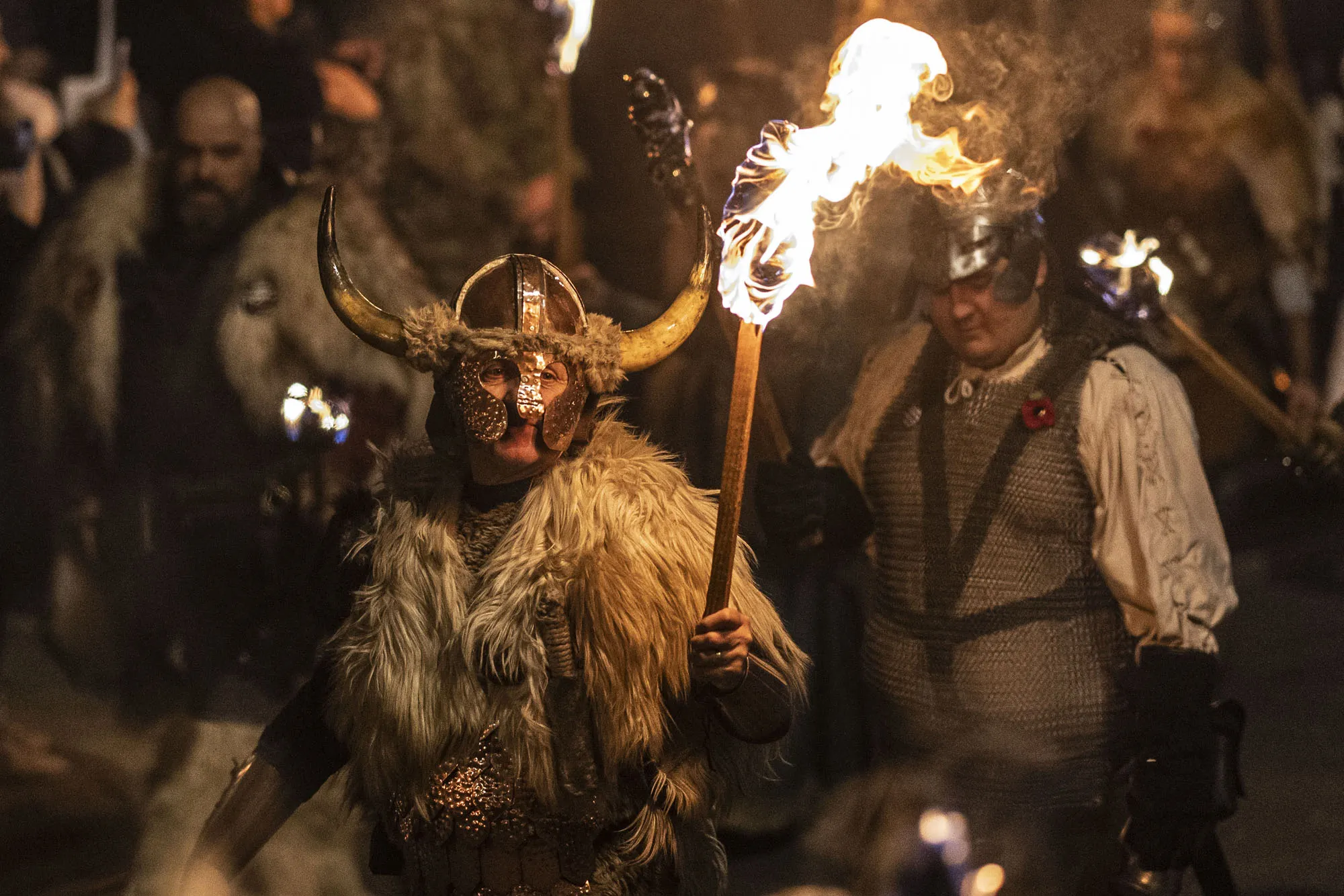 People take part in the parade at the annual Lewes Bonfire Night Celebrations on November 5, 2021 in Lewes, England. The event commemorates the memory of the seventeen Protestant martyrs as Bonfire Societies parade through the narrow streets. The evening comes to an end with the burning of effigies, or “guys” usually representing Guy Fawkes, who died in 1605 after an unsuccessful attempt to blow up The Houses of Parliament, and other topical figures. The annual parade was cancelled last year due to the Covid-19 pandemic. (Photo by Dan Kitwood/Getty Images)
