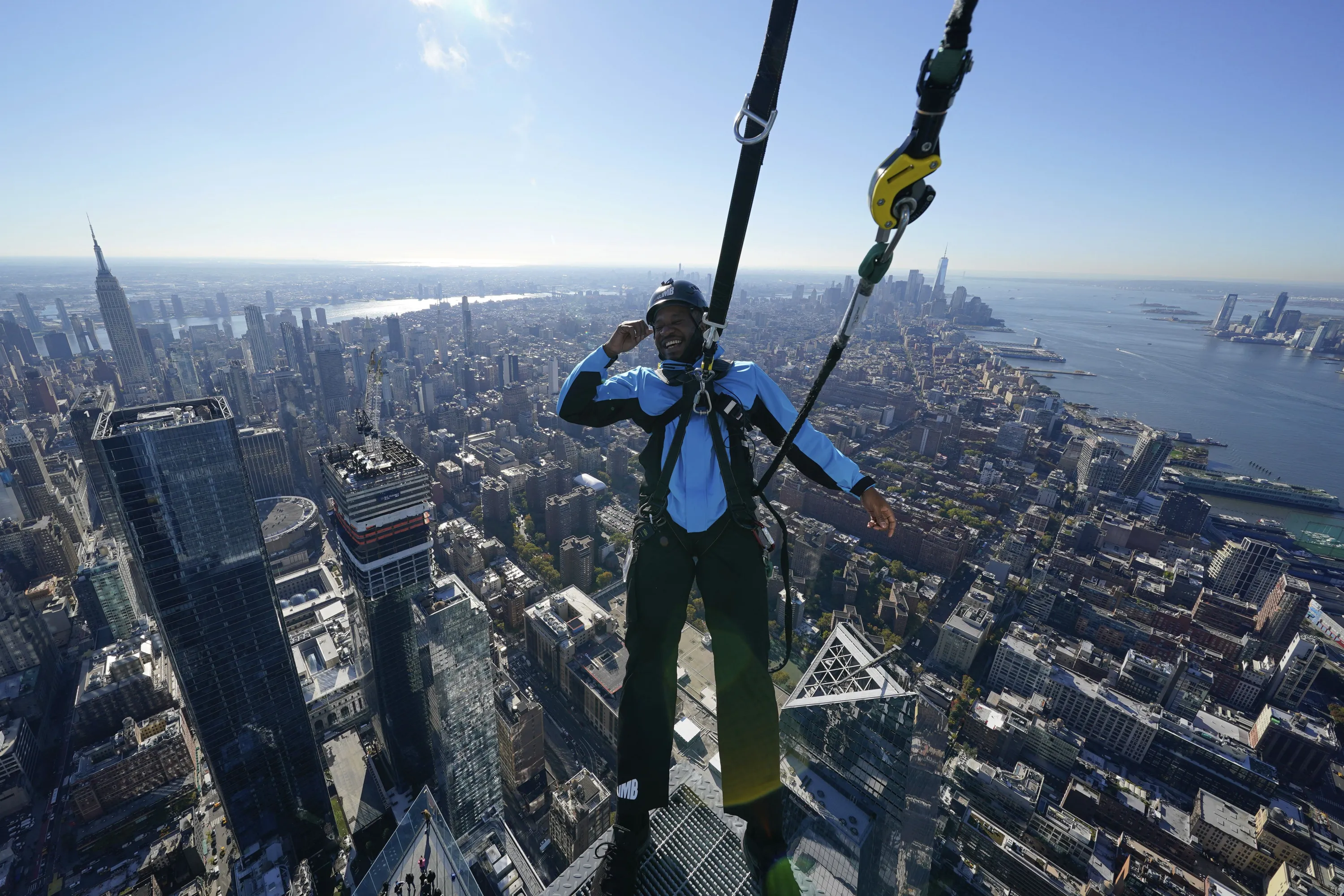 Climb guide Jason Johnson leans off the edge at the top of City Climb, a new attraction at 30 Hudson Yards in New York, Wednesday, November 3, 2021. The attraction opening Tuesday, Nov. 9 gives thrill-seekers a unique perspective on New York City from almost 1,300 feet up. At the top, a safety harness allows the climber to lean out over New York City and enjoy a panoramic view in the fresh air, unimpeded by glass. (Photo by Seth Wenig/AP Photo)