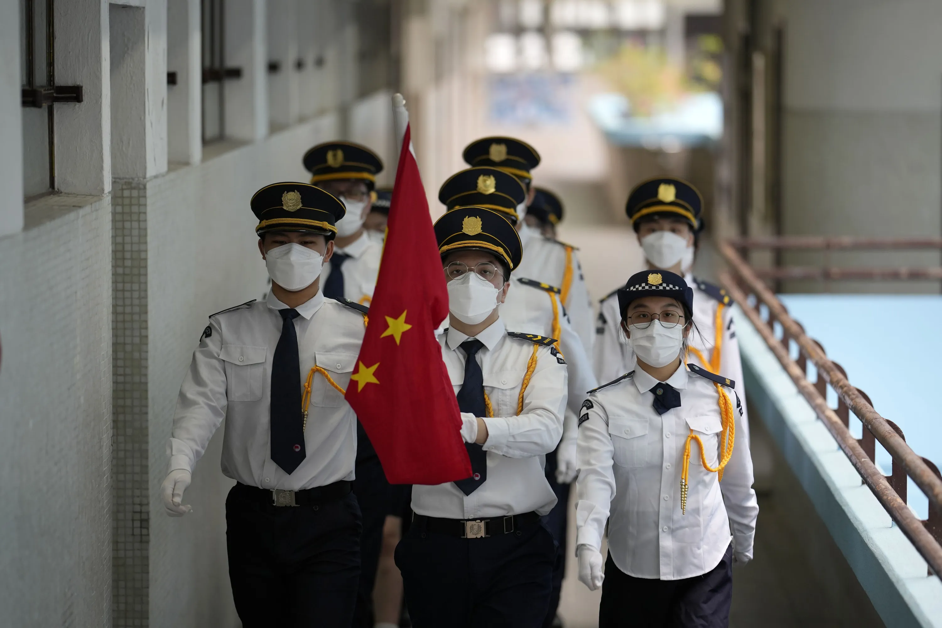Students wearing face masks attend a Chinese national flag raising ceremony during at a secondary school to mark the 25th anniversary of Hong Kong handover to China, in Hong Kong, Thursday, June 30, 2022. (Photo by Kin Cheung/AP Photo)