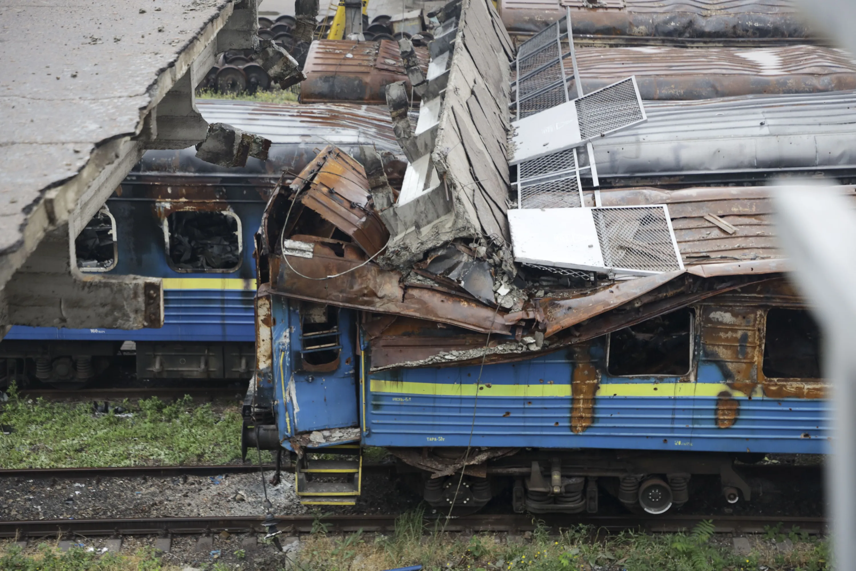 A collapsed bridge lies on burned-out wagons standing on the tracks at the station in Mariupol, in an area controlled by Russian-backed separatist forces, eastern Ukraine, Monday, July 11, 2022. (Photo by AP Photo/Stringer)