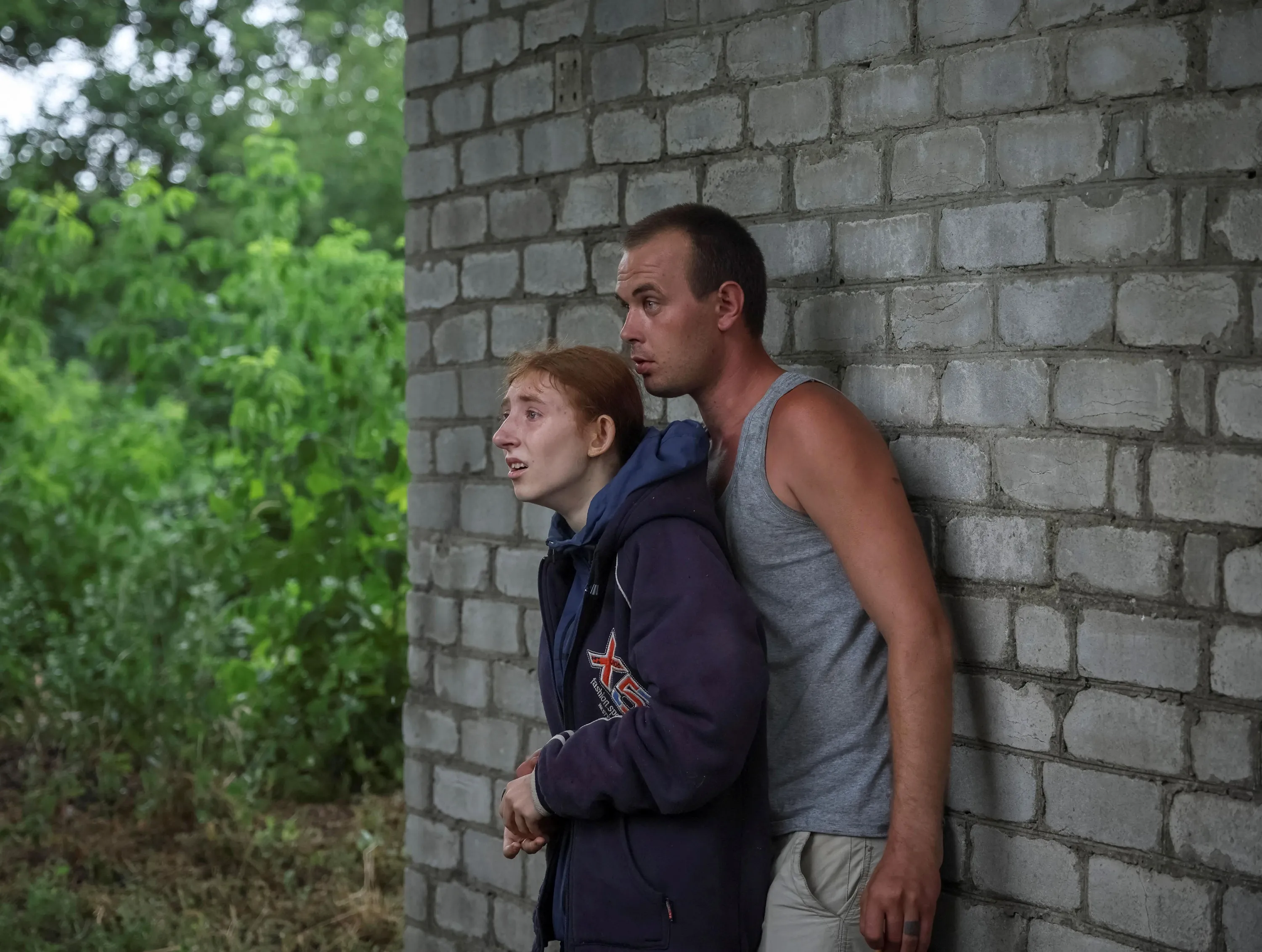 Local residents watch rescuers work as they wait for news about their relatives, who are under the rubble of a residential building damaged by a Russian military strike in the town of Chasiv Yar, in Donetsk region, Ukraine on July 10, 2022. (Photo by Gleb Garanich/Reuters)