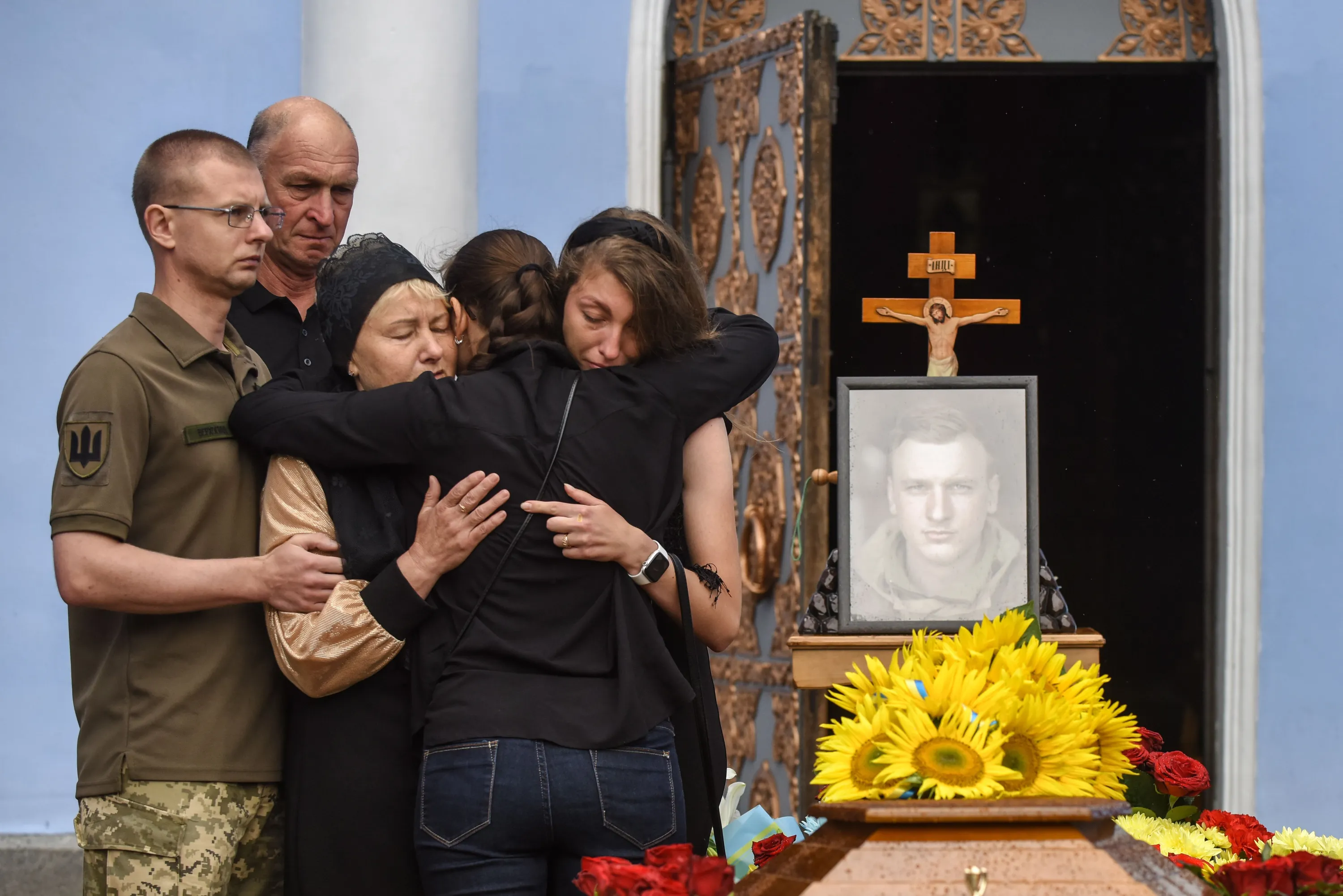 Relatives, friends, and comrades of Ukrainian serviceman Andrii Verkhoglyad attend his funeral ceremony at St. Michael's Golden-Domed Monastery in Kyiv (Kiev), Ukraine, 08 July 2022. Andrii, commander of the 3rd battalion of the 72nd infantry brigade, was killed in combat on 23 June near Svitlodarsk, Donetsk Oblast, amid the Russian invasion of Ukraine. (Photo by Oleg Petrasyuk/EPA/EFE)