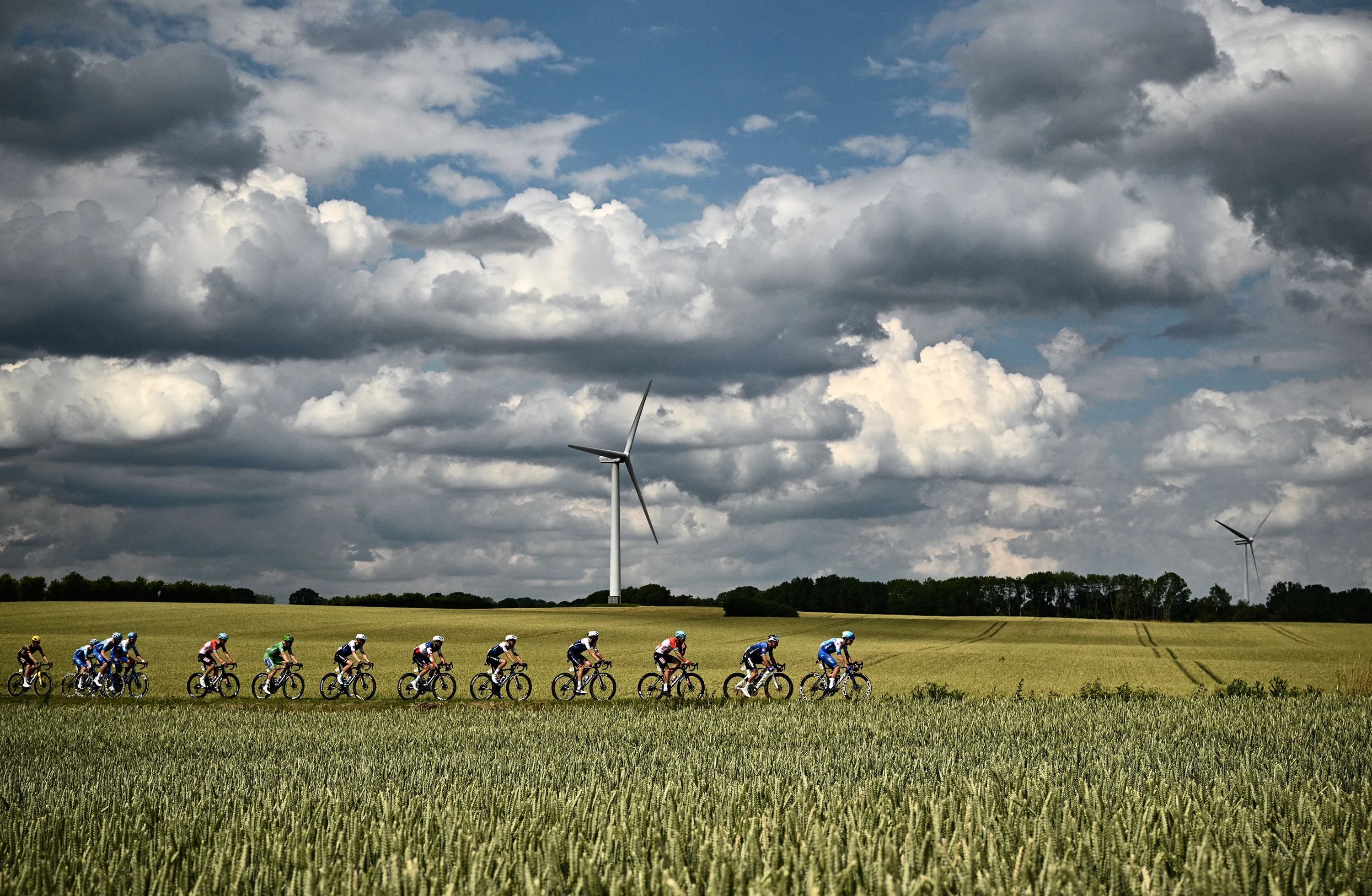 The pack of riders cycles past fields during the 3rd stage of the 109th edition of the Tour de France cycling race, 182 km between Vejle and Sonderborg in Denmark, on July 3, 2022. (Photo by Marco Bertorello/AFP Photo)