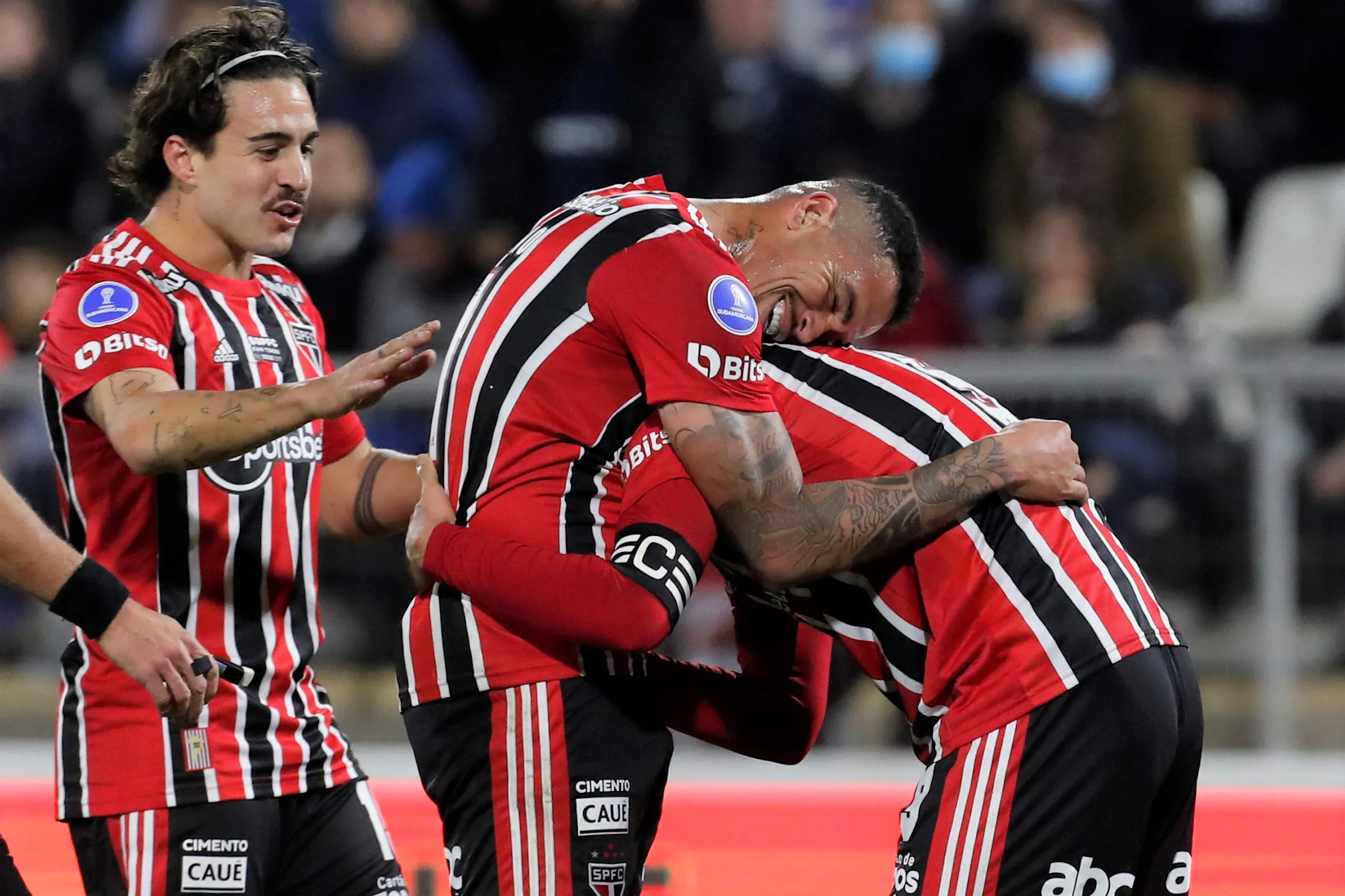 Luciano of Brazil's Sao Paulo, center, celebrates with teammate Jonathan Calleri after scoring his side's 2nd goal against Chile's Universidad Catolica during a Copa Sudamericana round of sixteen first leg soccer match in Santiago, Chile, Thursday, June 30, 2022. (Photo by Luis Hidalgo/AP Photo)