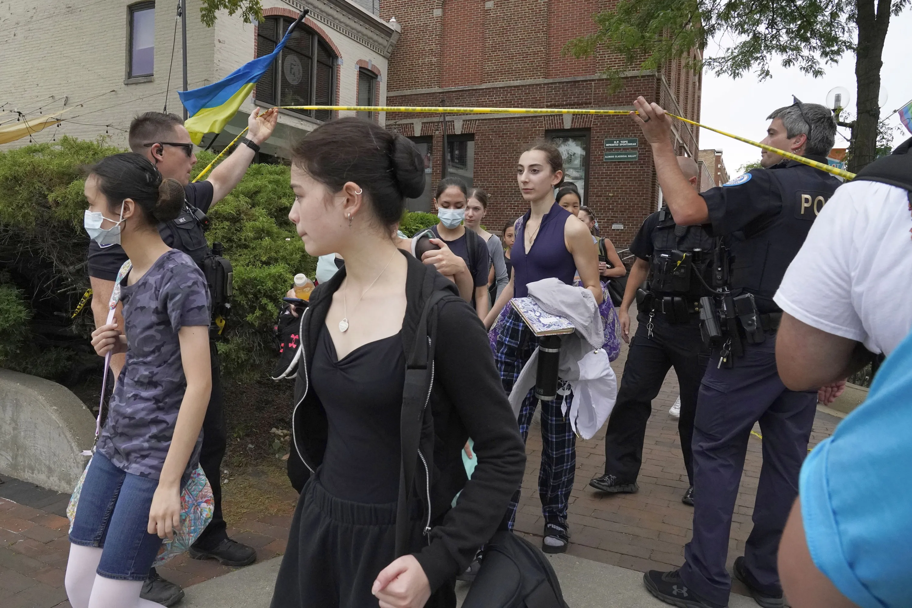 Students are escorted by police officers as they cross under police tape after a mass shooting at the Highland Park Fourth of July parade in downtown Highland Park, Ill., a Chicago suburb on Monday, July 4, 2022. (Photo by Nam Y. Huh/AP Photo)