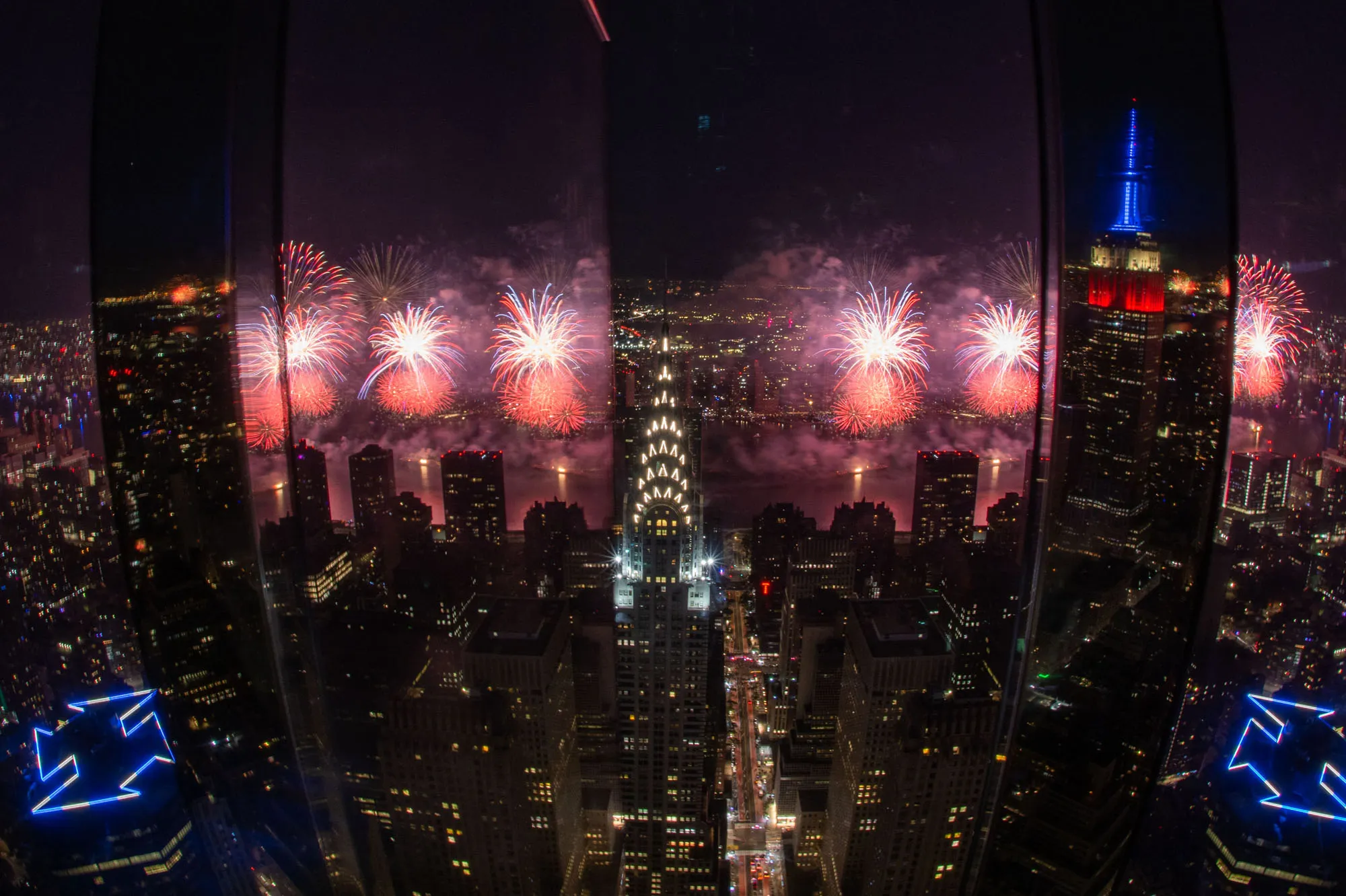 Fireworks explode on the East River during the 46th annual Macy’s 4th of July Fireworks display overlooking The Chrysler Building with the Empire State Building reflected from Summit One Vanderbilt as part of the first year that it’s open on July 4th, 2022 in New York City. This was the first year Summit One Vanderbilt was open to the public giving spectators a view of the fireworks over the Manhattan and Brooklyn skyline from above 1000 feet in the air. This year’s celebration included more than 48,000 shells and effects from five barges and was approximately 25 minutes long. (Photo by Alexi Rosenfeld/ Getty Images)