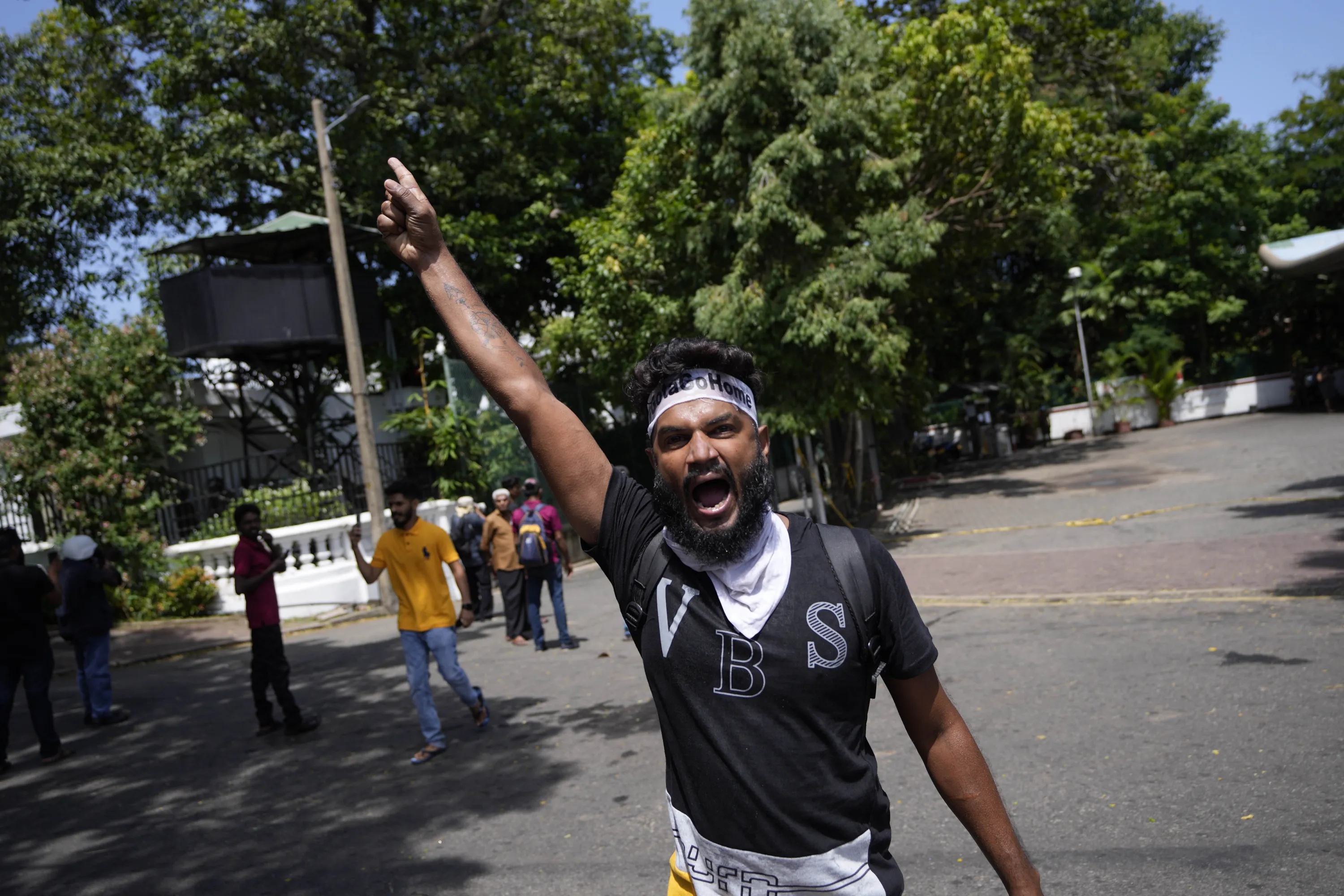 A protester shouts slogans as he joins others to storm the compound of Sri Lankan Prime Minister Ranil Wickremesinghe's office, demanding he resign after president Gotabaya Rajapaksa fled the country amid economic crisis in Colombo, Sri Lanka, Wednesday, July 13, 2022. Rajapaksa fled on a military jet on Wednesday after angry protesters seized his home and office, and appointed Prime Minister Ranil Wickremesinghe as acting president while he is overseas. Wickremesinghe quickly declared a nationwide state of emergency to counter swelling protests over the country's economic and political collapse. (Photo by Eranga Jayawardena/AP Photo)