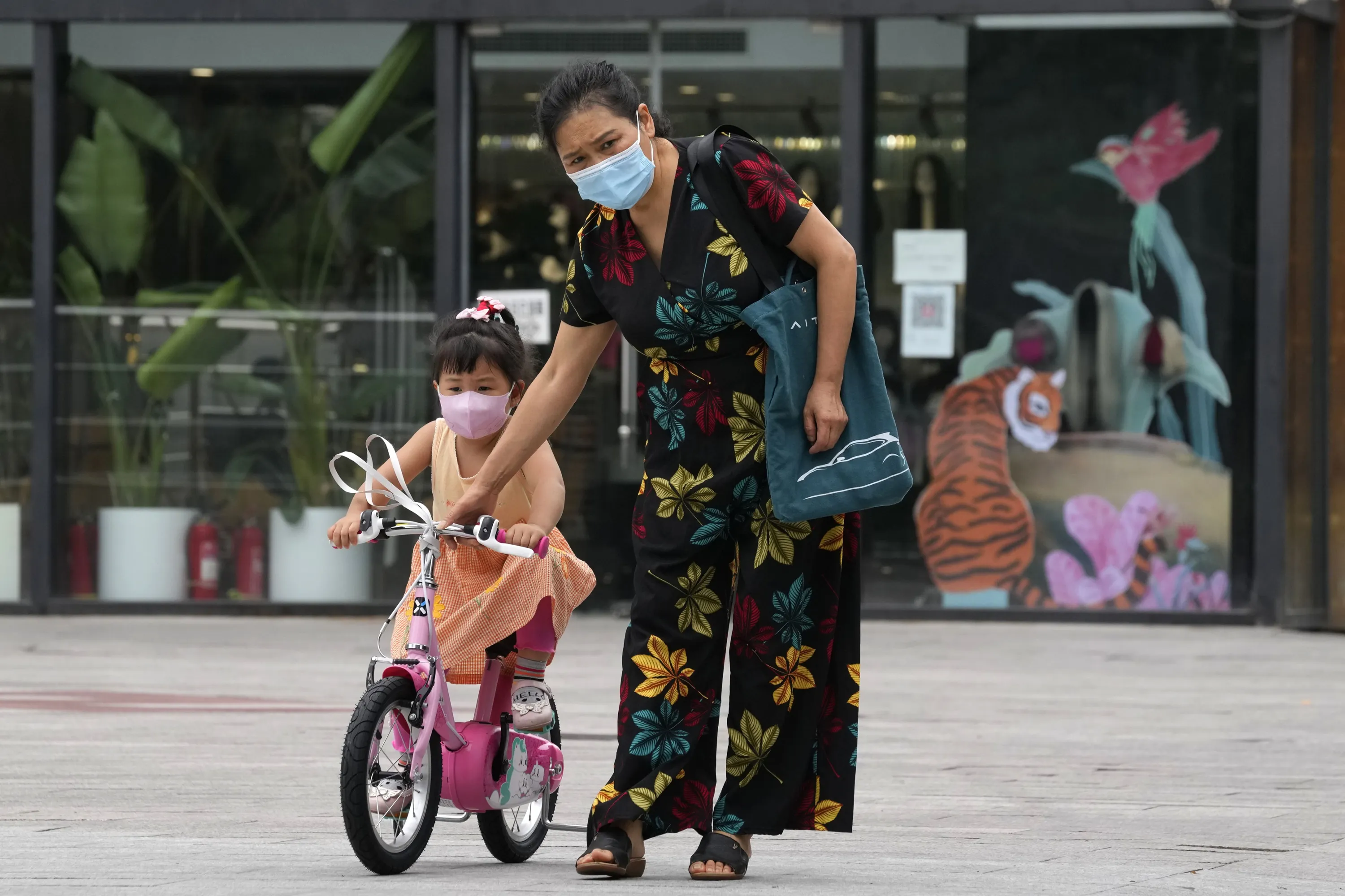 A woman helps a child with her bike on the street, Wednesday, July 6, 2022, in Beijing. (Photo by Ng Han Guan/AP Photo)
