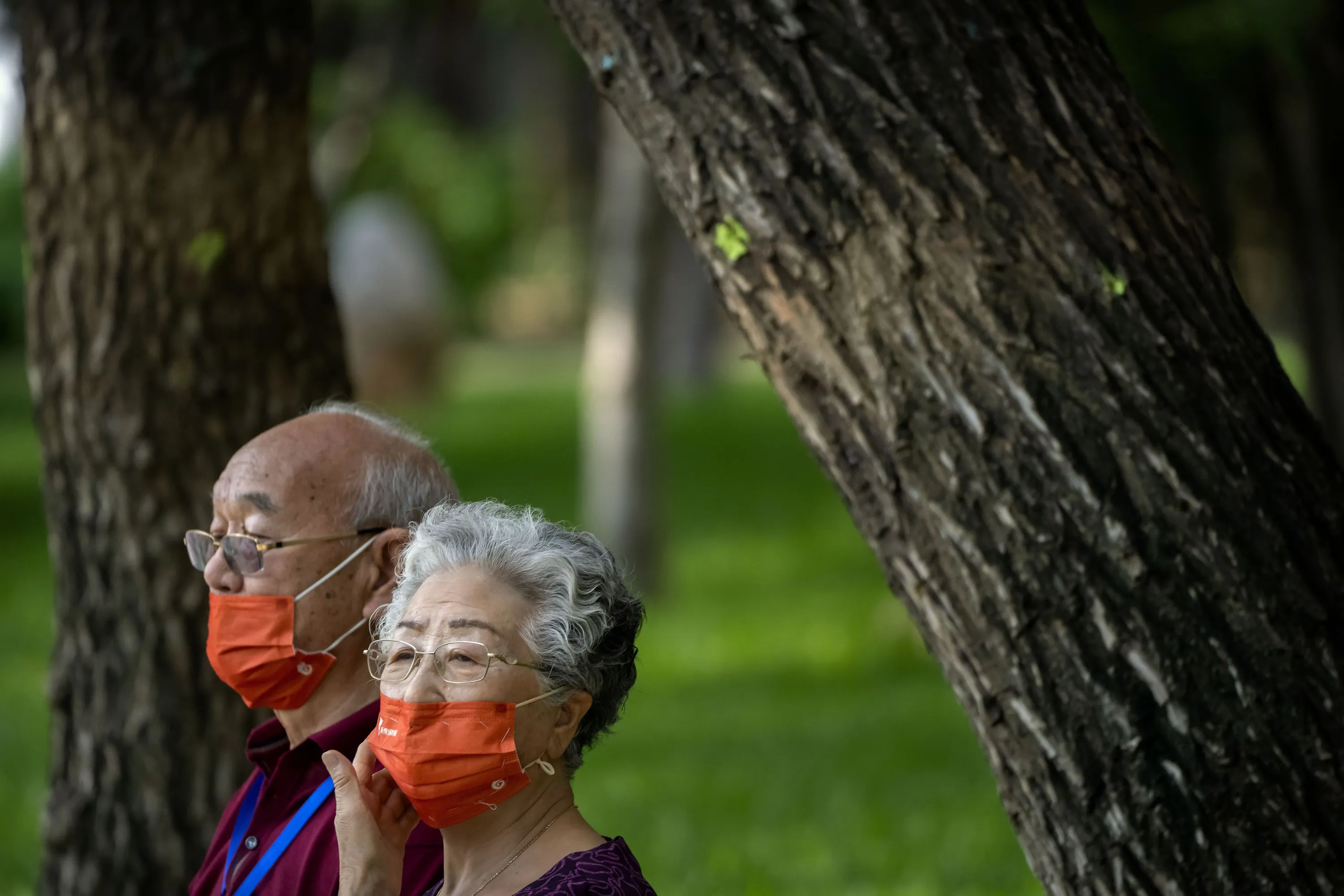 People wearing face masks sit on a bench at a public park in Beijing, Friday, July 8, 2022. (Photo by Mark Schiefelbein/AP Photo)