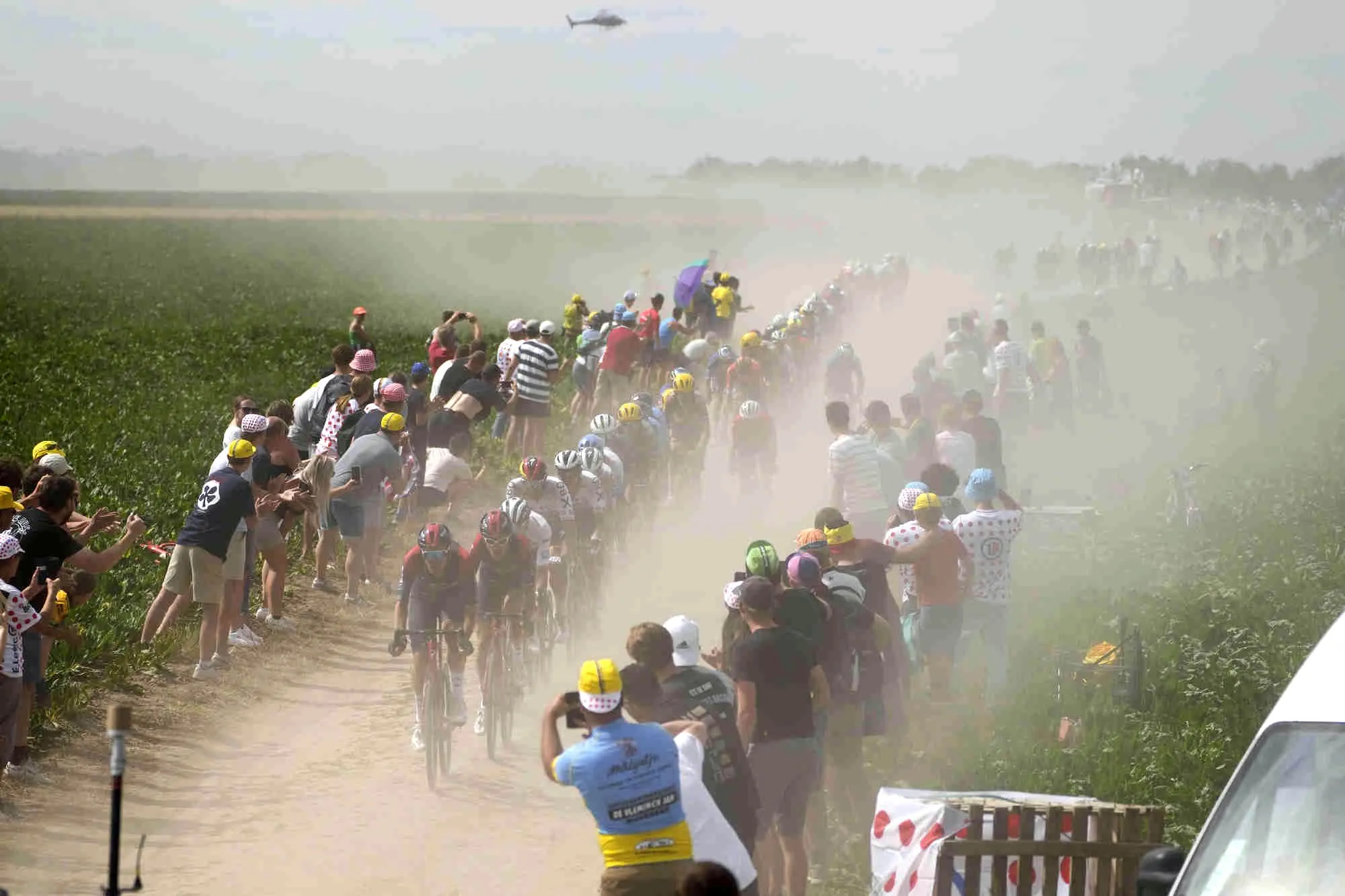 The pack with Britain's Geraint Thomas in second position rides over the cobblestones during the fifth stage of the Tour de France cycling race over 157 kilometers (97.6 miles) with start in Lille Metropole and finish in Arenberg Porte du Hainaut, France, Wednesday, July 6, 2022. (Photo by Thibault Camus/AP Photo)
