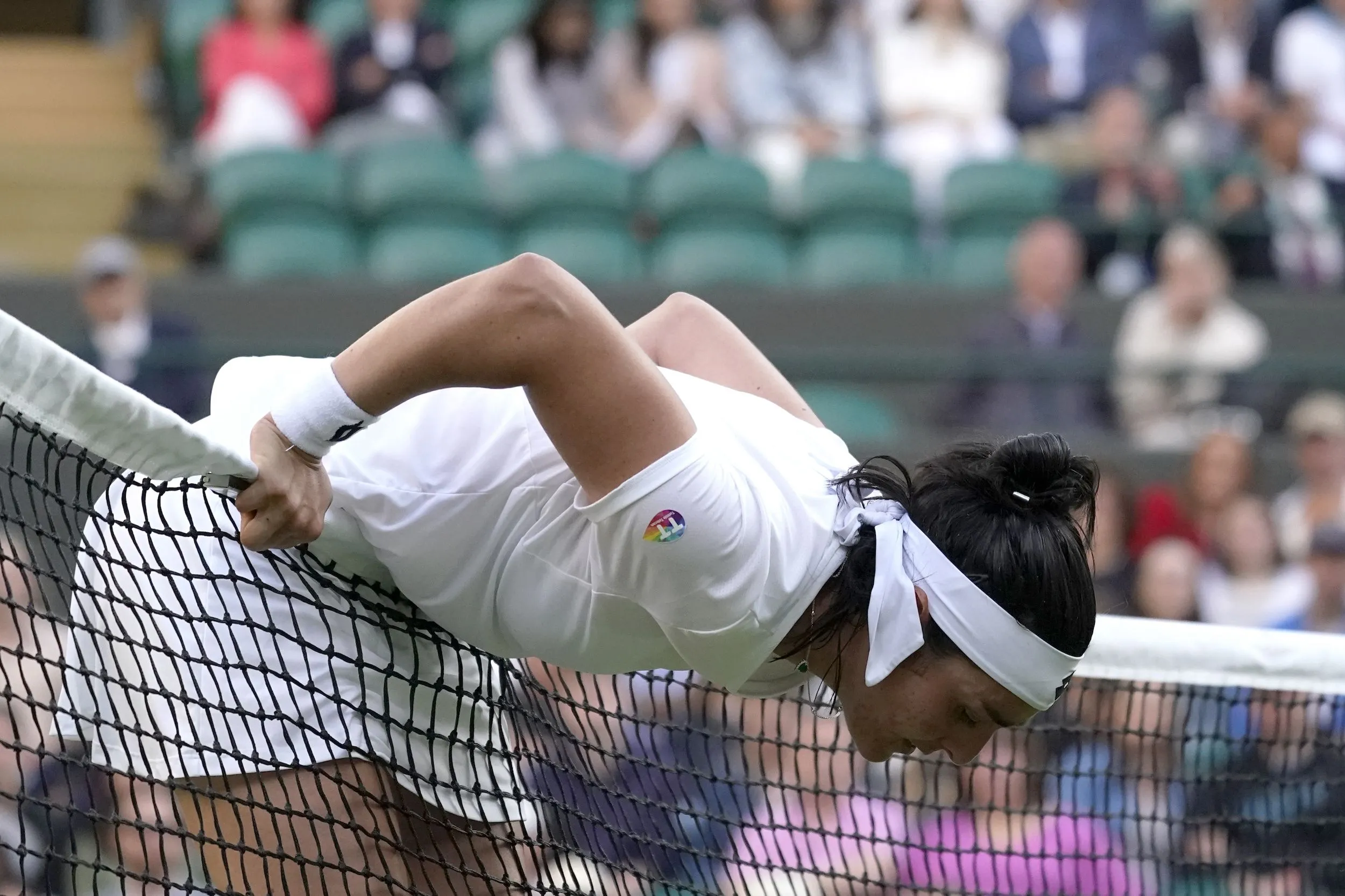 Tunisia's Ons Jabeur is dejected after losing a point to Belgium's Elise Mertens during a fourth round women's singles match on day seven of the Wimbledon tennis championships in London, Sunday, July 3, 2022. (Photo by Alberto Pezzali/AP Photo)