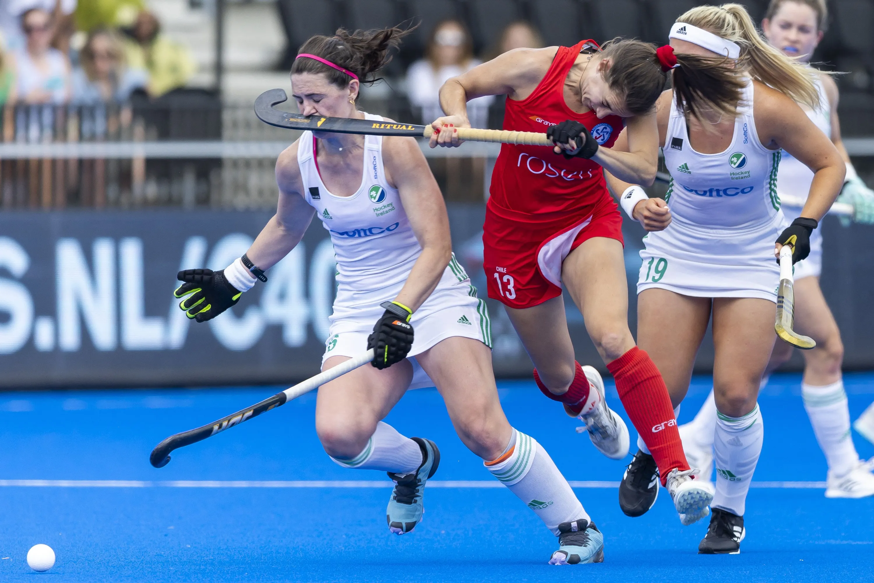 Ireland's Roisin Upton (L) gets a stick to the face during a duel with Chile's Camila Caram during the hockey match between Ireland and Chile at the World Hockey Championships at the Wagener stadium, in Amsterdam, on July 5, 2022. (Photo by Willem Vernes/ANP via AFP Photo)