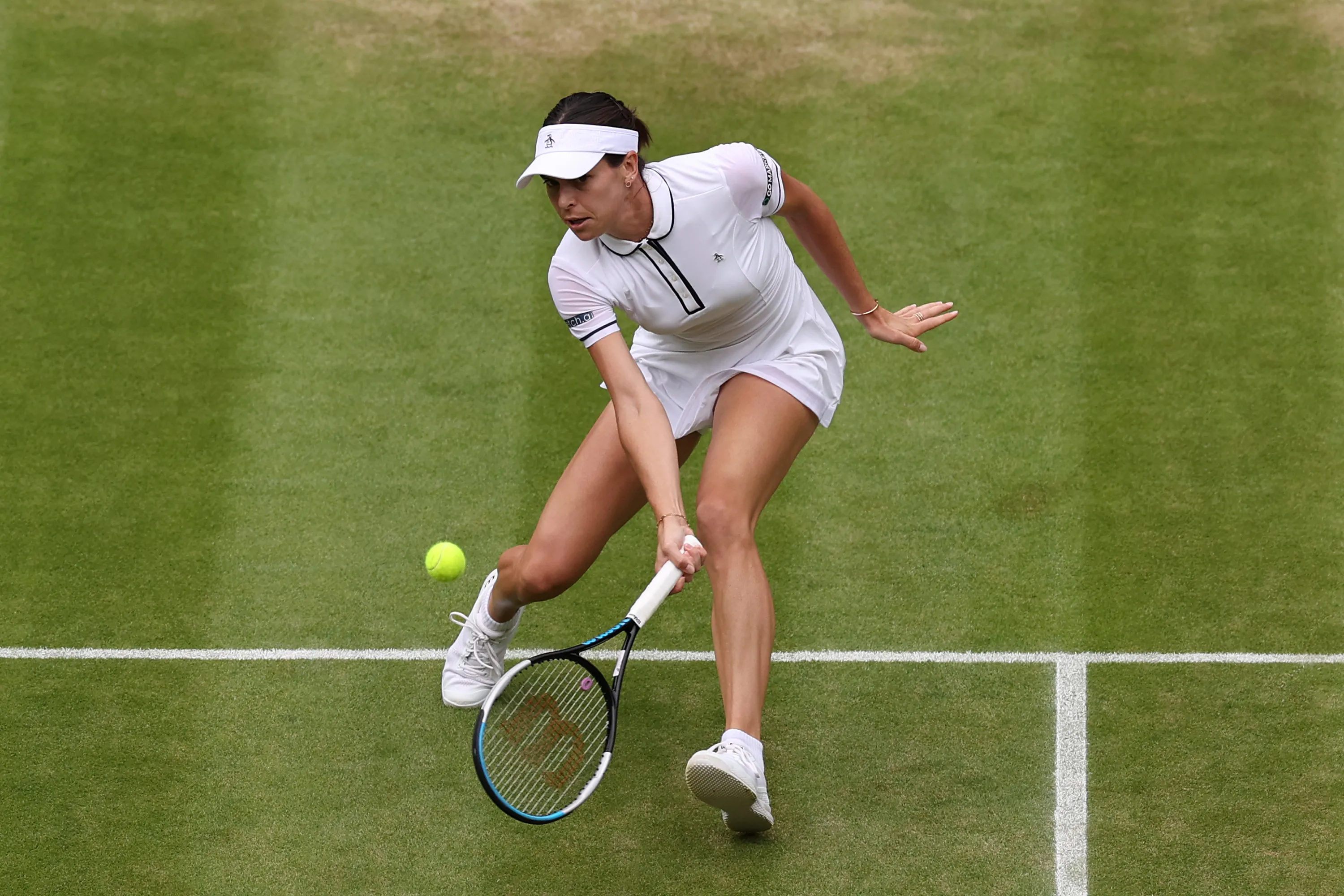 Ajla Tomljanovic of Australia plays a forehand against Elena Rybakina of Kazakhstan during their Women's Singles Quarter Final match on day ten of The Championships Wimbledon 2022 at All England Lawn Tennis and Croquet Club on July 06, 2022 in London, England. (Photo by Ryan Pierse/Getty Images)