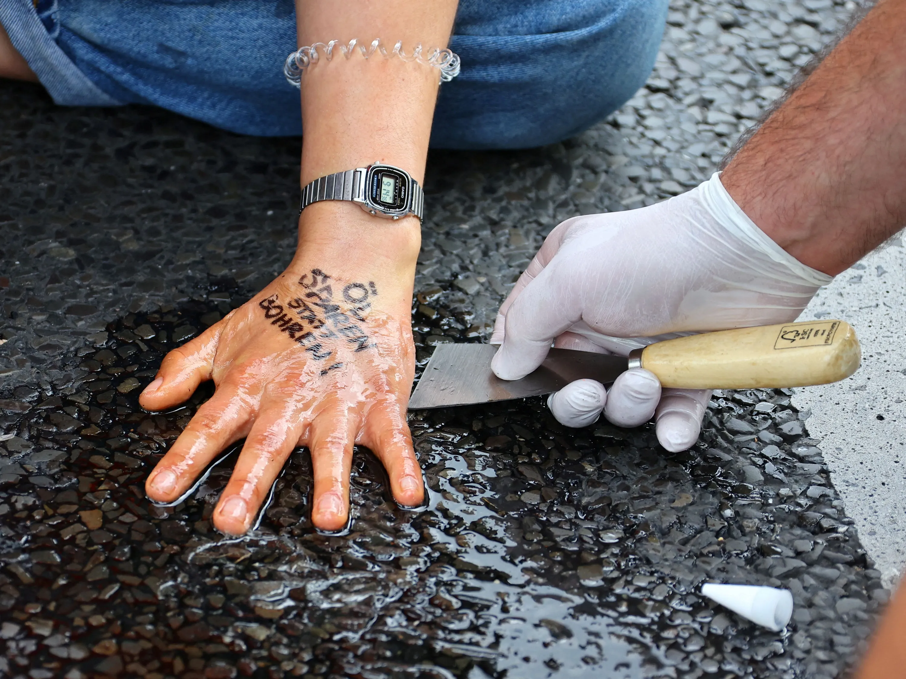 A police officer removes glue from the hand of a “Letzte Generation” (Last Generation) activist that reads “save oil instead of drill oil”, blocking a road under the slogan “Let's stop the fossil madness!” for an end to fossil fuels and against oil drilling in the North Sea, in Berlin, Germany, July 15, 2022. (Photo by Fabrizio Bensch/Reuters)