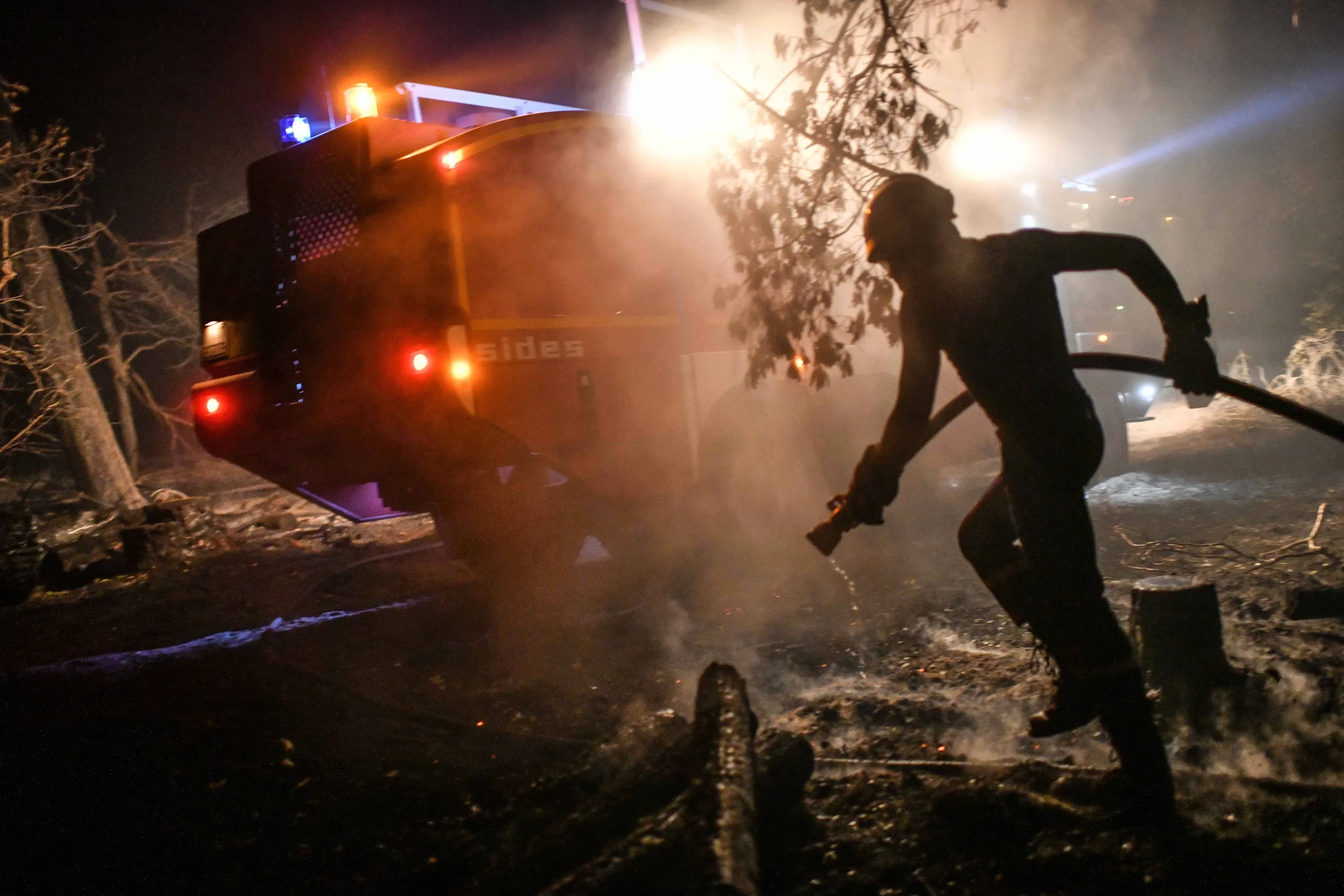 A firefighter at work to extinguish a wildfire close to the beach of Cazaux lake. The Fire Broke Out at the Bottom of the Pyla Dune in La Teste de Buch, July 15, 2022. (Photo by Ugo Amez/Sipa Press/Rex Features/Shutterstock)