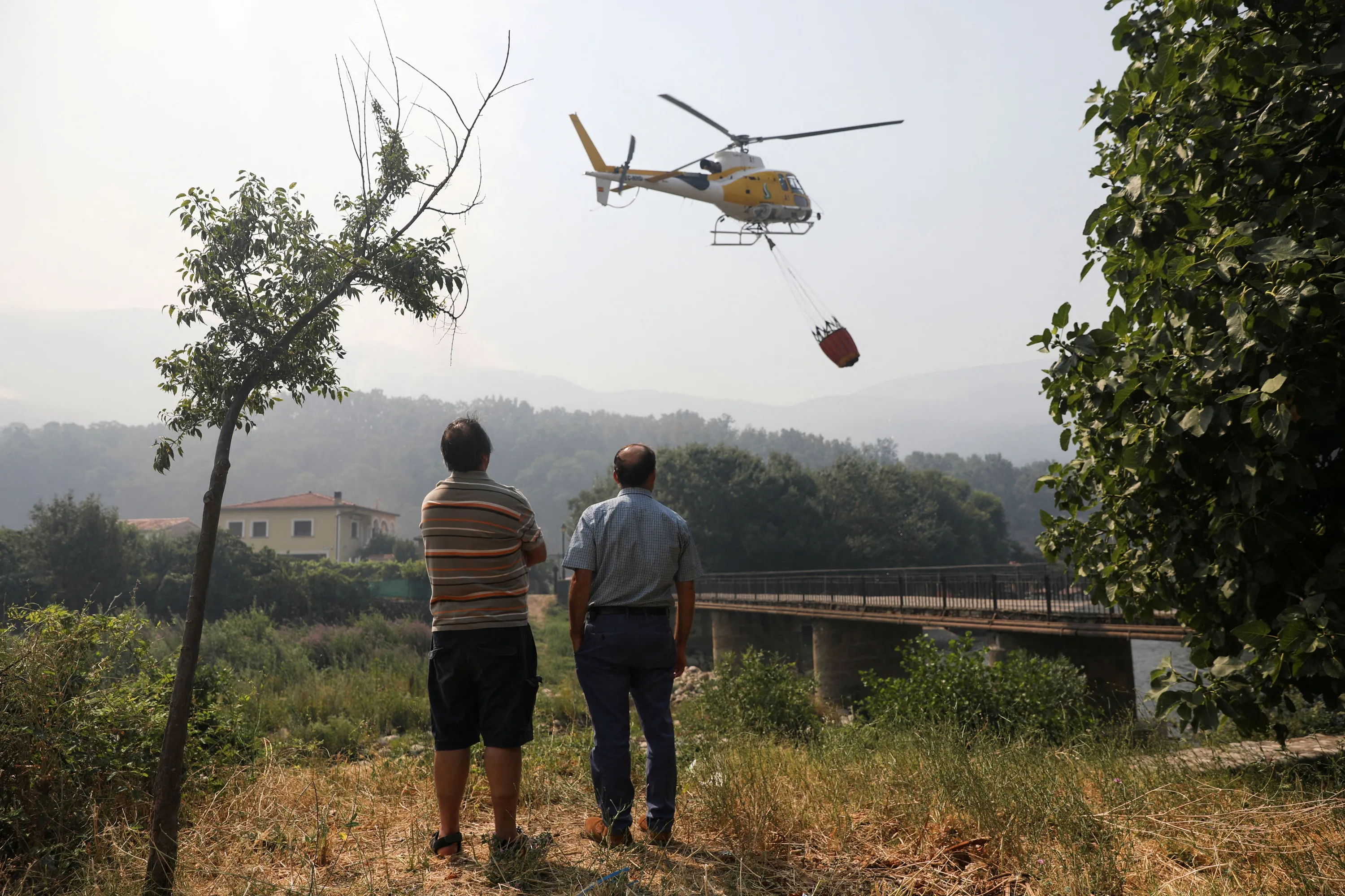 People watch as a helicopter works on containing a wildfire at Garganta de los Infiernos natural reserve, during the second heatwave of the year, in Jerte, Spain on July 17, 2022. (Photo by Isabel Infantes/Reuters)