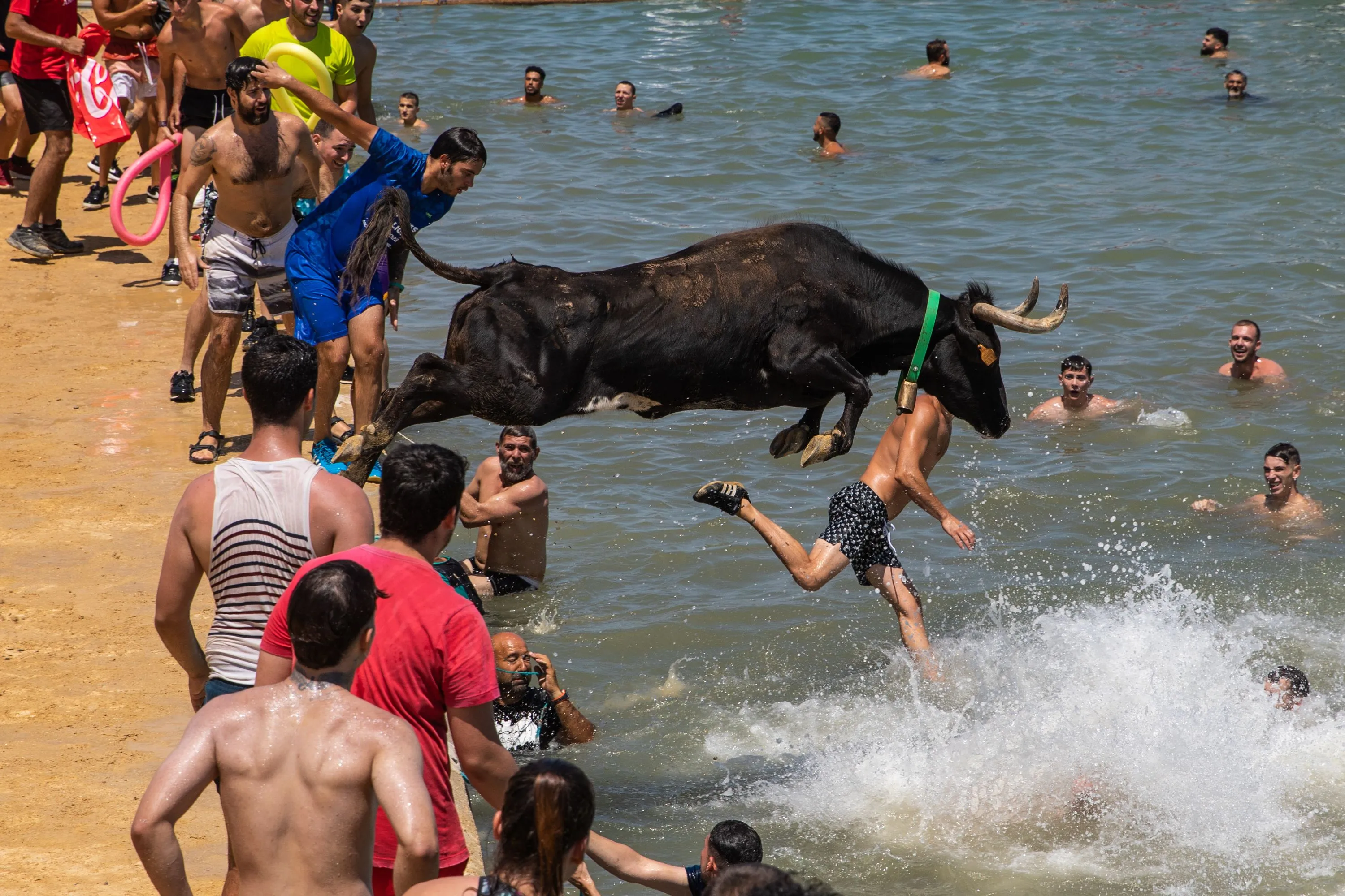 A bull throws himself into the sea and tries to catch up with participants during the “Bous a la Mar” festival on July 17, 2022 in Denia, Spain. The bull-evading event at DÈnia's port is part of an annual festival honoring of the SantÌsima Sangre (SantÌssima Sang), patron saint of DÈnia. (Photo by Zowy Voeten/Getty Images)
