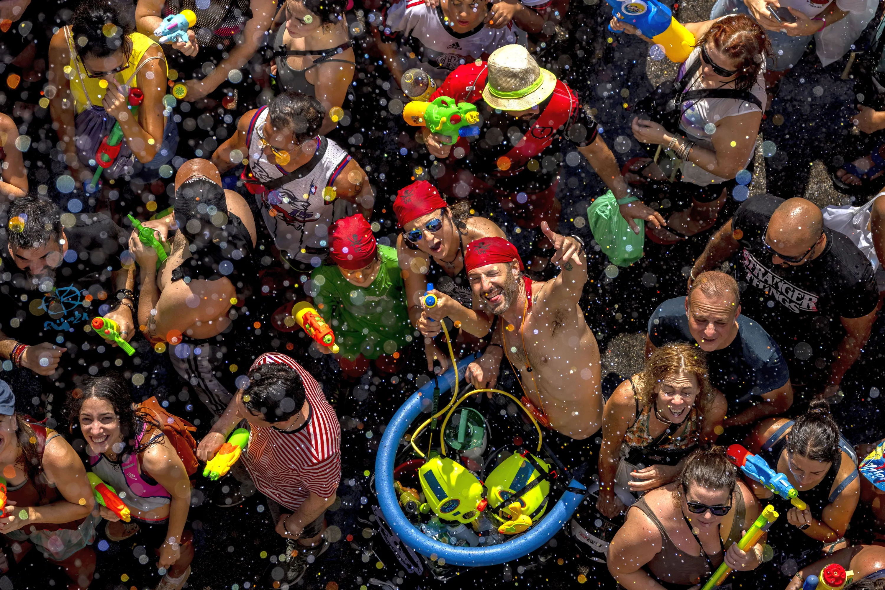 People take part during the annual water fight in the streets of the Vallecas neighborhood of Madrid, Spain, Sunday, July 17, 2022. (Photo by Manu Fernandez/AP Photo)