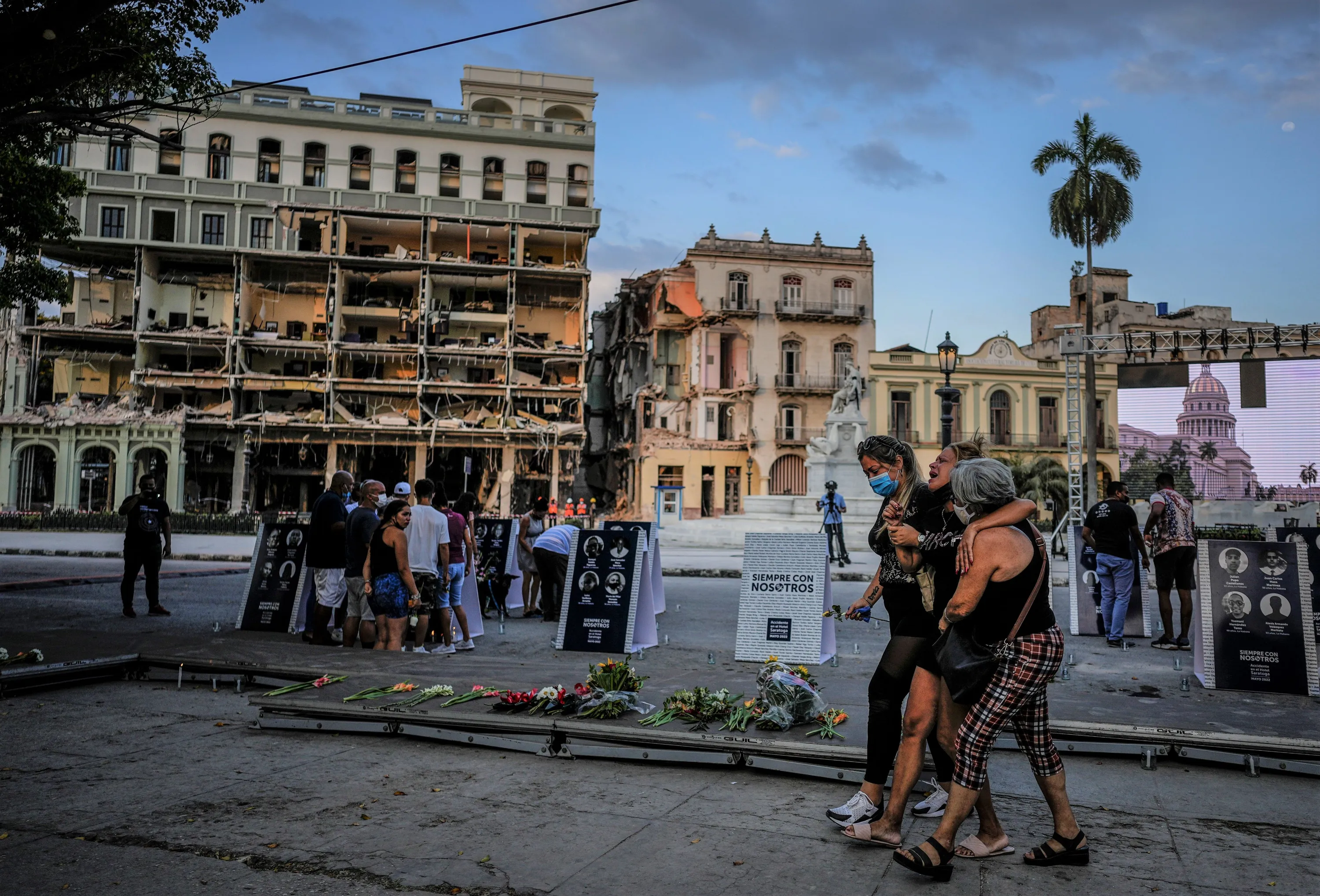 Relatives cry as they walk past photos of their deceased relatives during a vigil, at the site of a deadly explosion that destroyed the five-star Hotel Saratoga in Old Havana, Cuba, Friday, May 13, 2022. Cuban President Miguel Diaz-Canel declared an official day of mourning Friday for the victims of the May 6th explosion. (Photo by Ramon Espinosa/AP Photo)