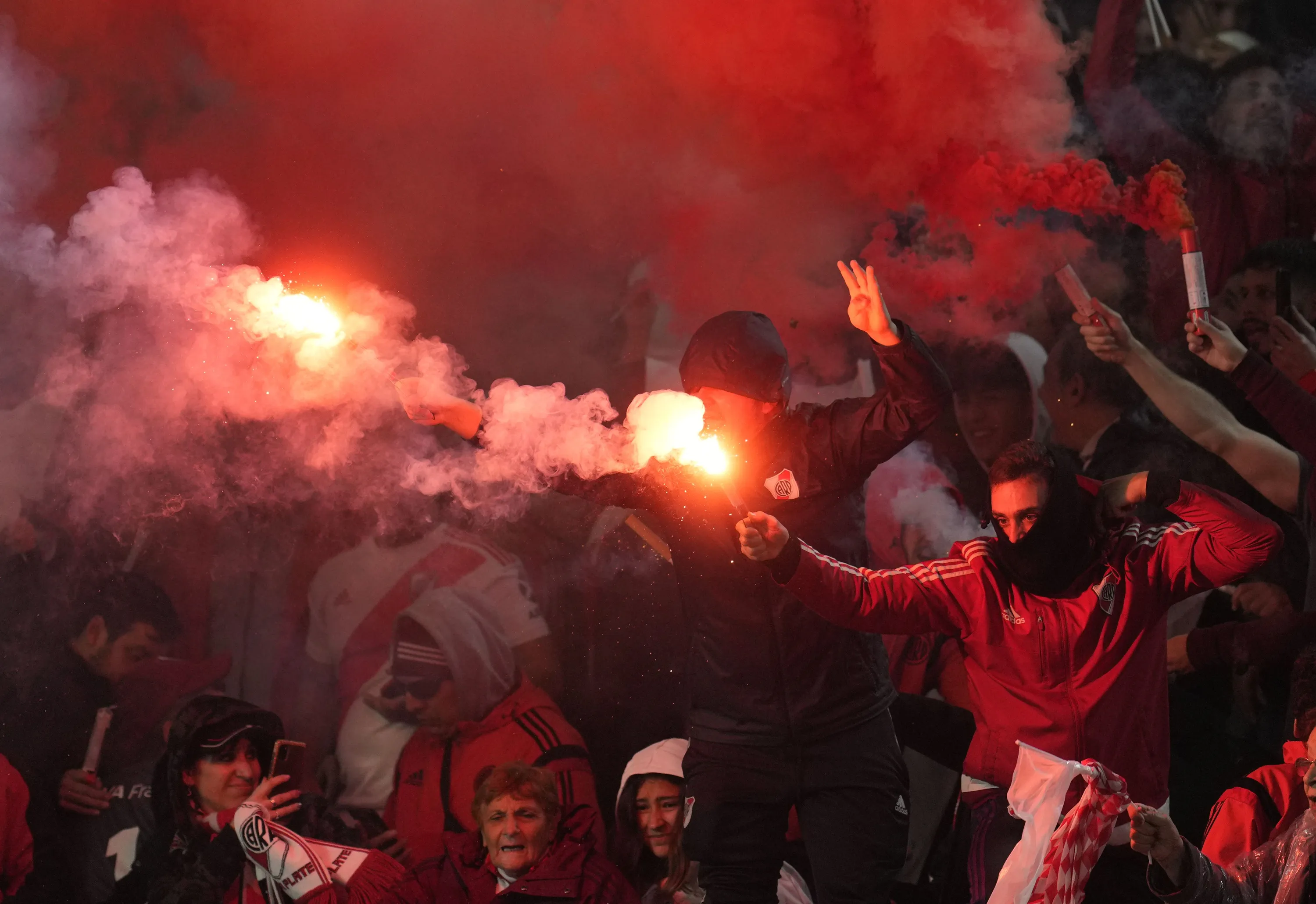 A fan of River Plate holds a flare in the stands during a Copa Libertadores round of sixteen, second leg soccer match against Velez Sarsfield at Monumental stadium in Buenos Aires, Argentina, Wednesday, July 6, 2022. (Photo by Natacha Pisarenko/AP Photo)