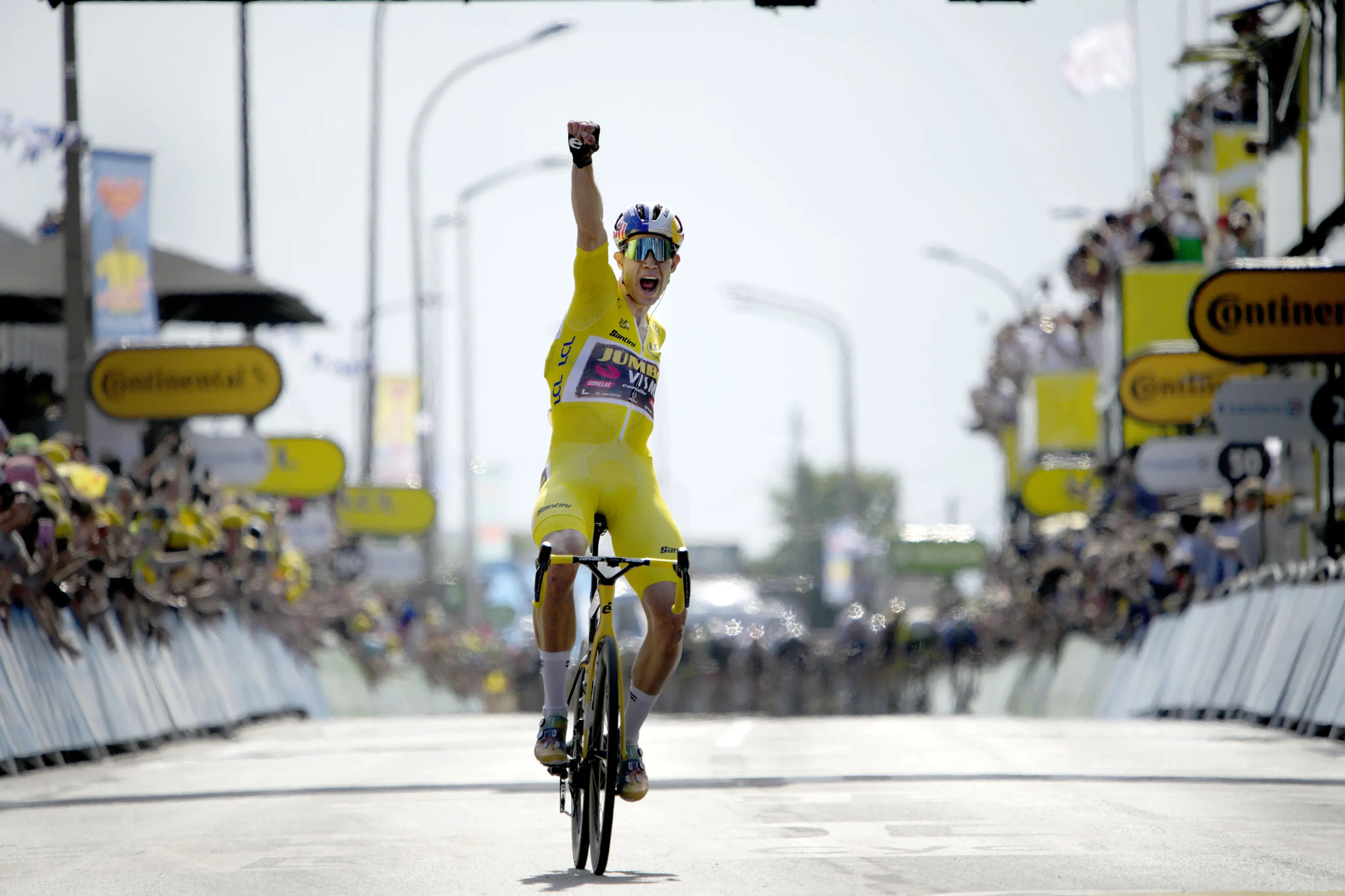 Belgium's Wout Van Aert, wearing the overall leader's yellow jersey celebrates as he crosses the finish line to win the fourth stage of the Tour de France cycling race over 171.5 kilometers (106.6 miles) with start in Dunkerque and finish in Calais, France, Tuesday, July 5, 2022. (Photo by Daniel Cole/AP Photo)
