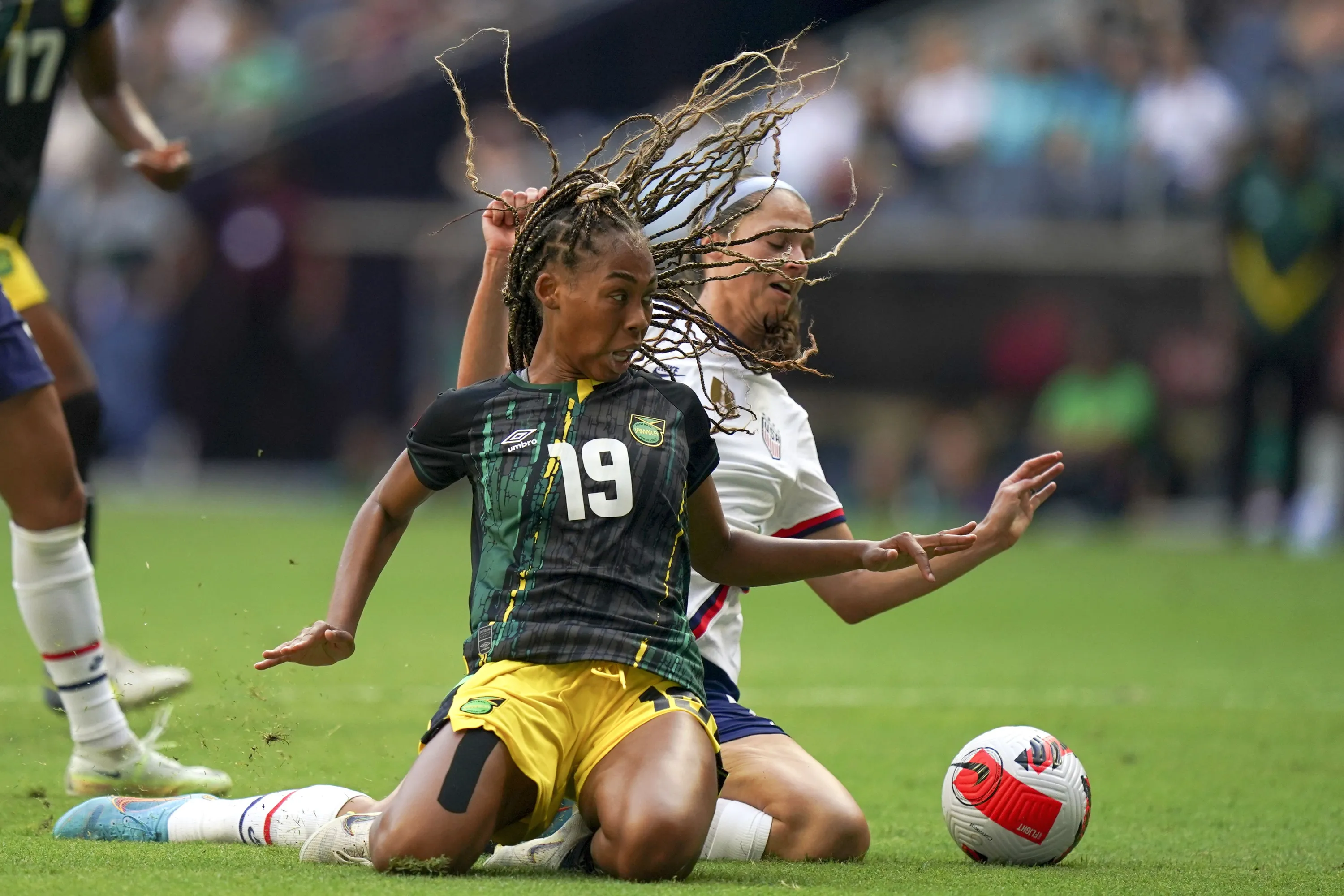 Jamaica's Tiernny Wiltshire (19) and United States' Sophia Smith fight for the ball during a CONCACAF Women's Championship soccer match in Monterrey, Mexico, Thursday, July 7, 2022. (Photo by Fernando Llano/AP Photo)