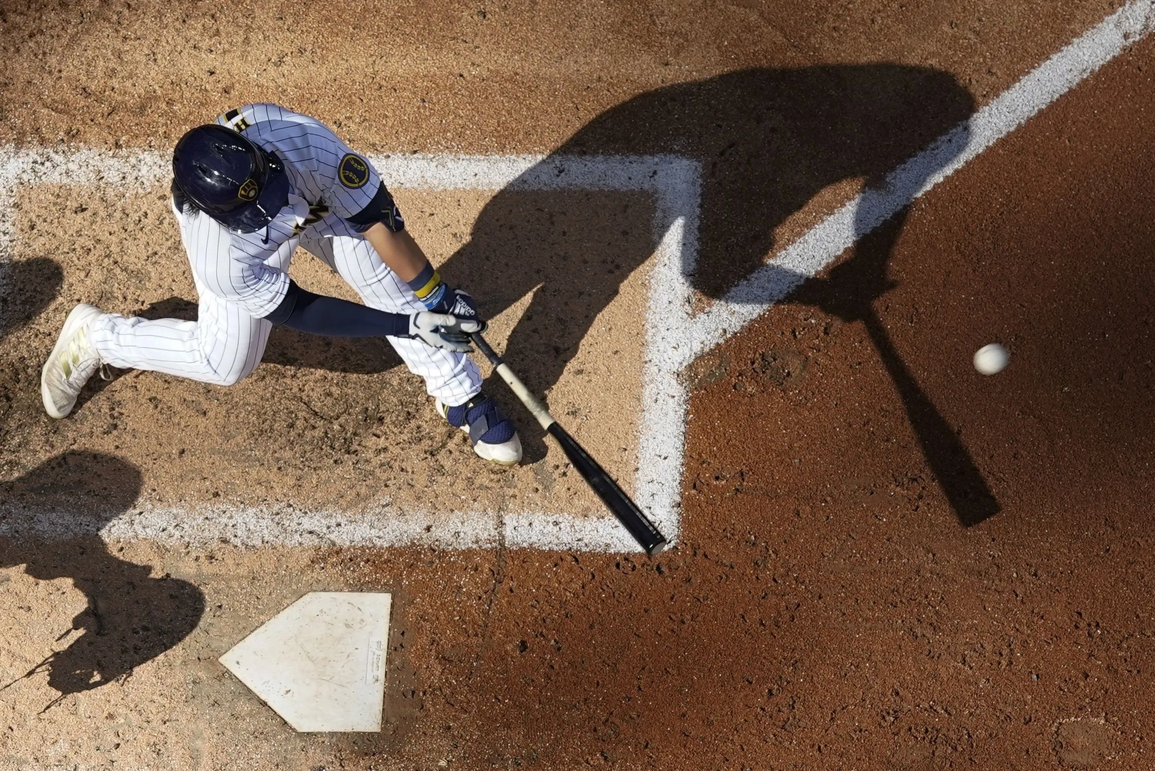 Milwaukee Brewers' Keston Hiura hits an RBI single during the sixth inning of a baseball game against the Pittsburgh Pirates Saturday, July 9, 2022, in Milwaukee. (Photo by Morry Gash/AP Photo)