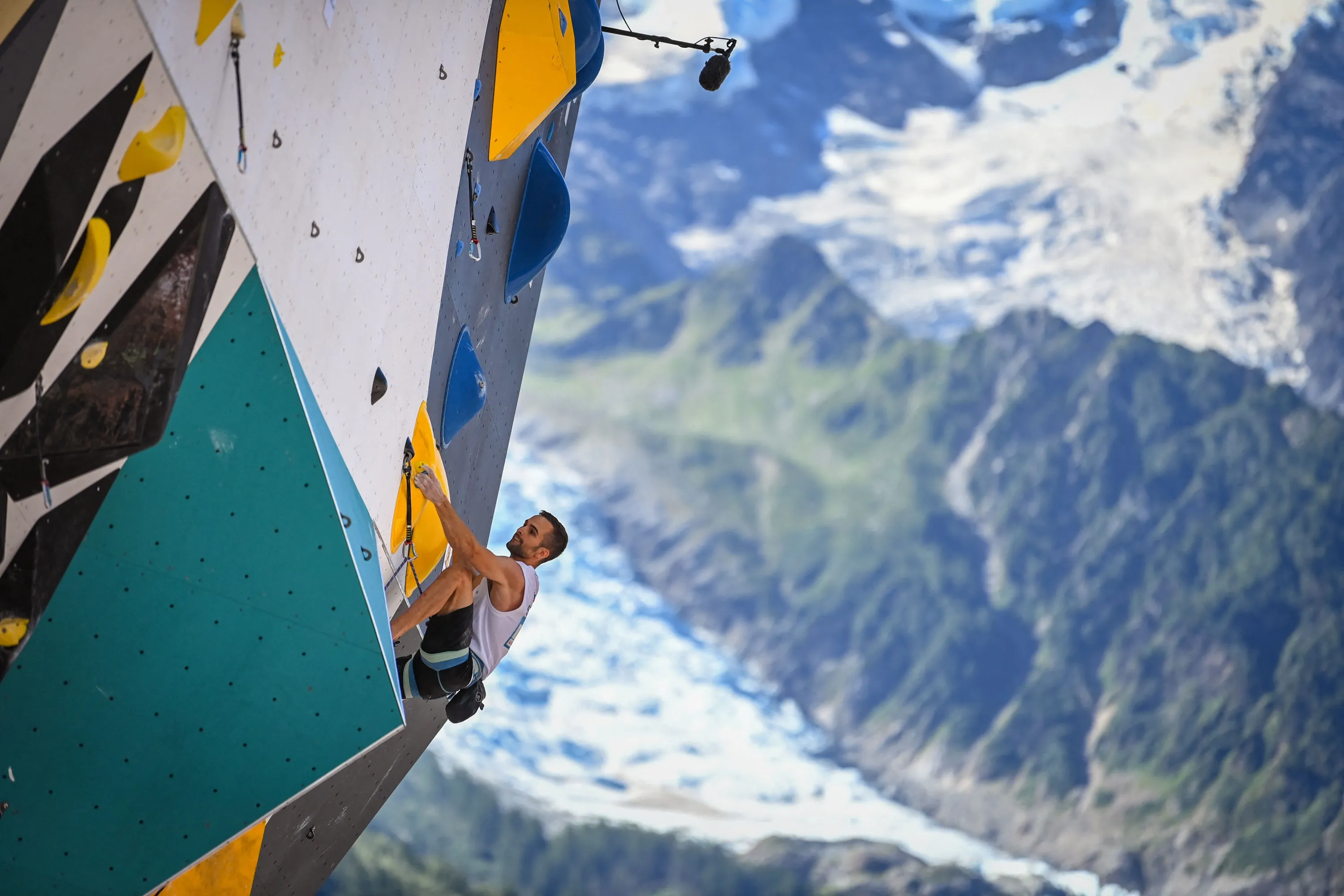 Slovenia's Milan Preskar competes in the semi-finals of the men's lead competition of the IFSC Climbing World Cup on Mont-Blanc square in Chamonix, French Alps, on July 9, 2022. (Photo by Olivier Chassignole/AFP Photo)