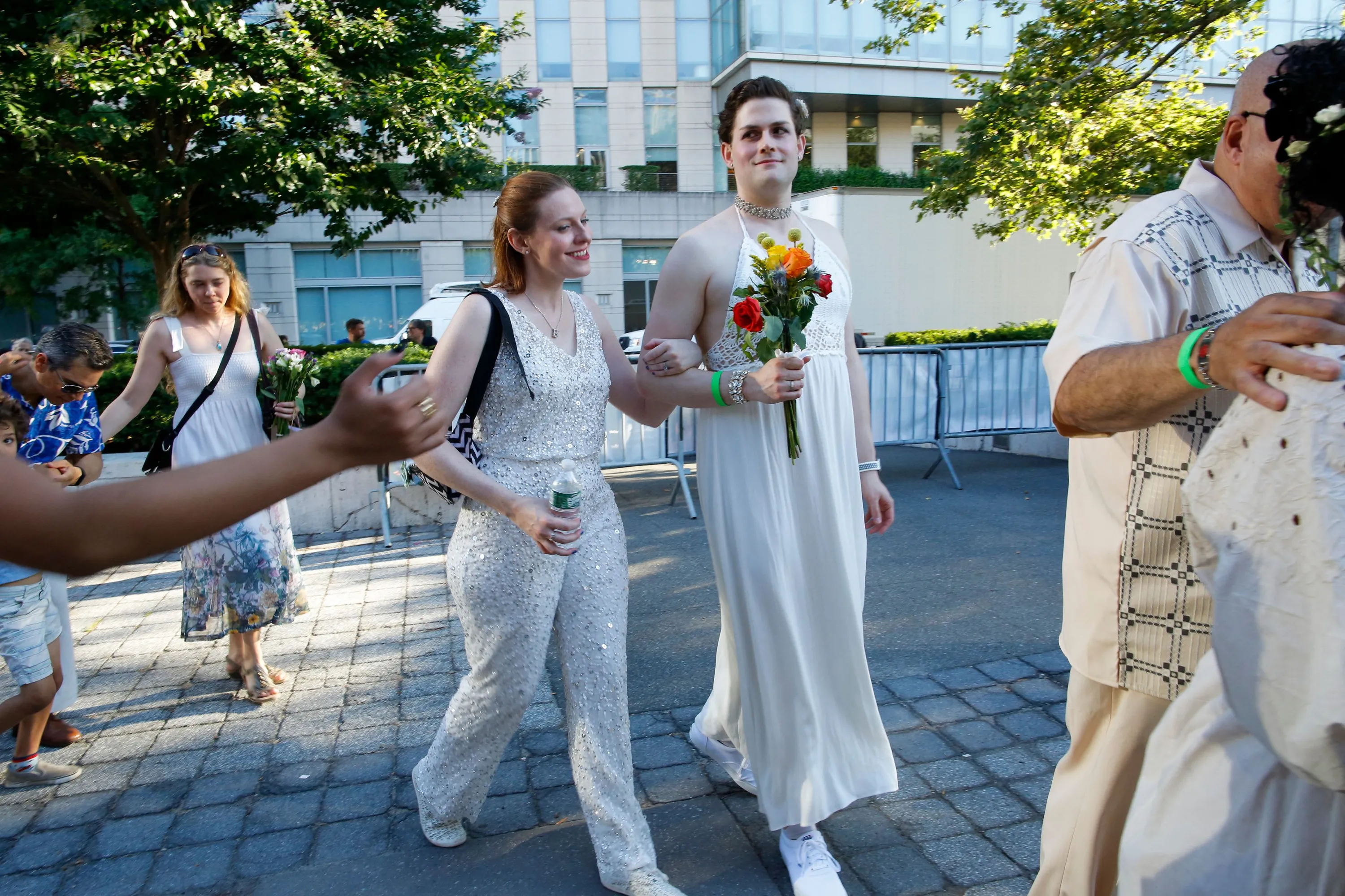Couples arrive to a mass wedding for covid-delayed couples at Lincoln Center in New York City on July 10, 2022. (Photo by Kena Betancur/AFP Photo)