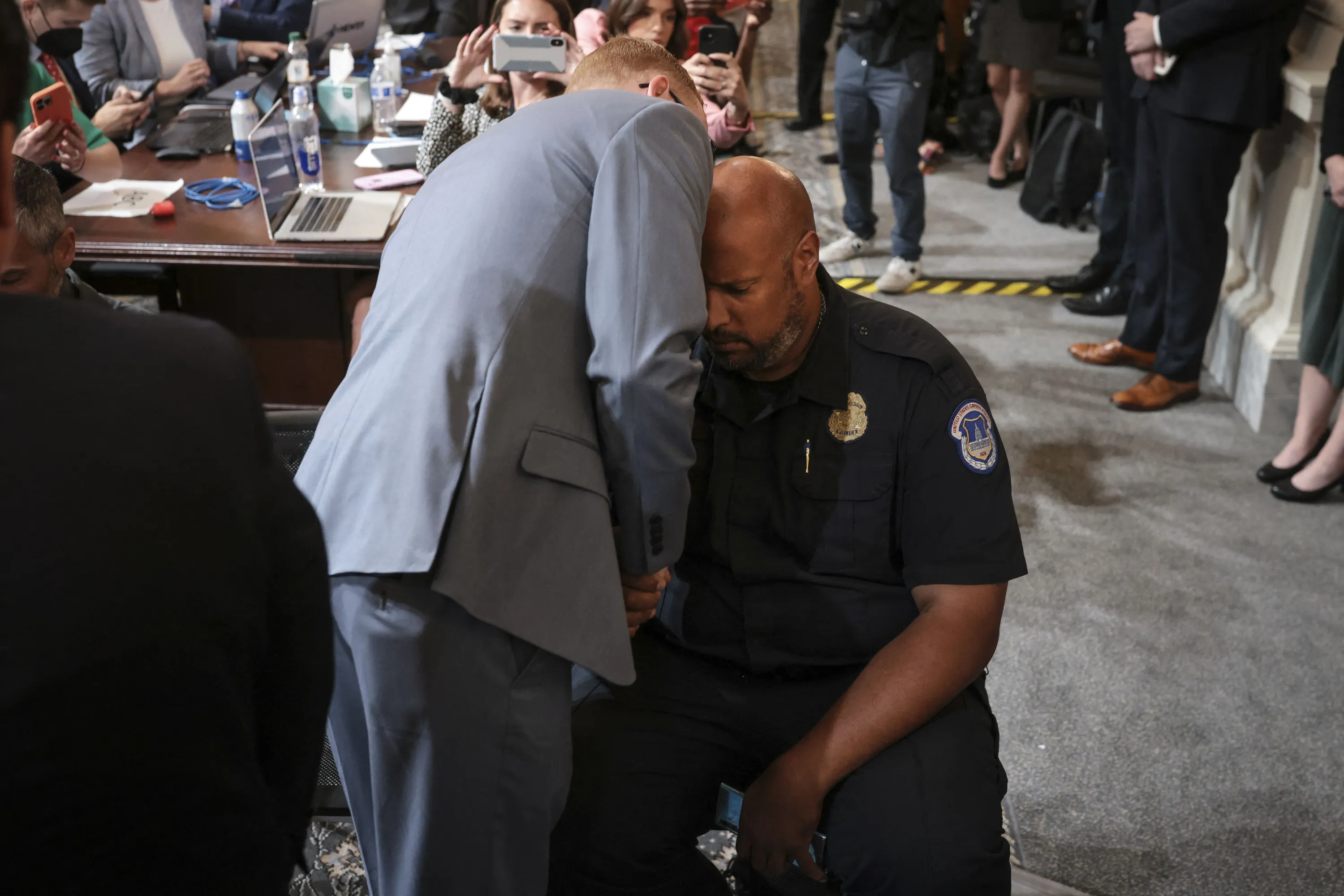 Stephen Ayres (L), who has pleaded guilty to entering the Capitol illegally on January 6, talks to US Capitol Police Officer Harry Dunn (R) at the conclusion of a full committee hearing on “the January 6th Investigation”, on Capitol Hill on July 12, 2022, in Washington, DC. The House committee probing the 2021 assault on the US Capitol is examining connections between associates of former US President Donald Trump and far right-wing extremist groups at its seventh hearing on Tuesday. (Photo by Oliver Contreras/AFP Photo)