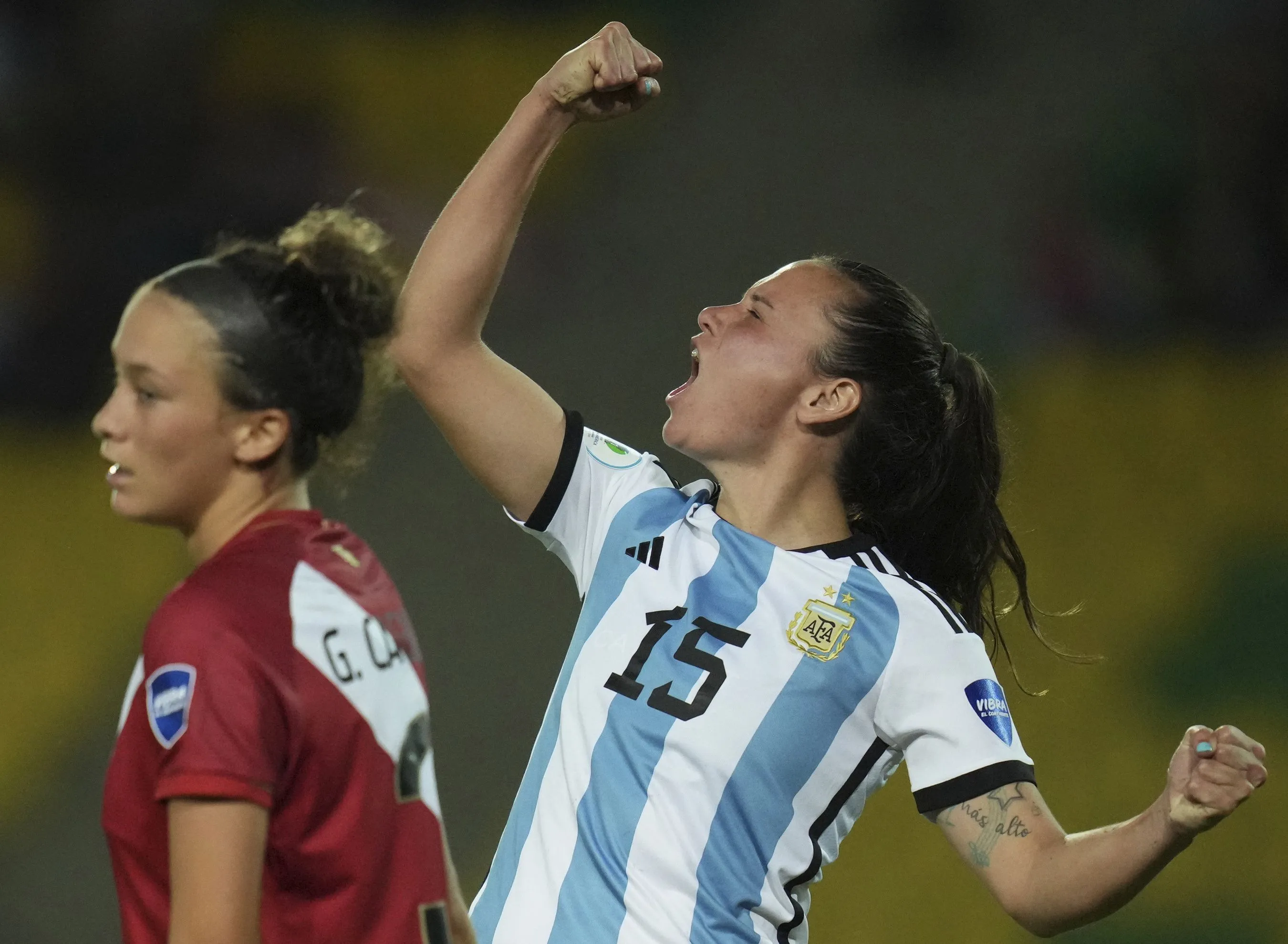 Argentina's Maria Bonsegundo celebrates scoring a goal next to rival Peru's Grace Canigna, during a Women's Copa America soccer match in Armenia, Colombia, Tuesday, July 12, 2022. Argentina went on to win the match 4-0. (Photo by Dolores Ochoa/AP Photo)