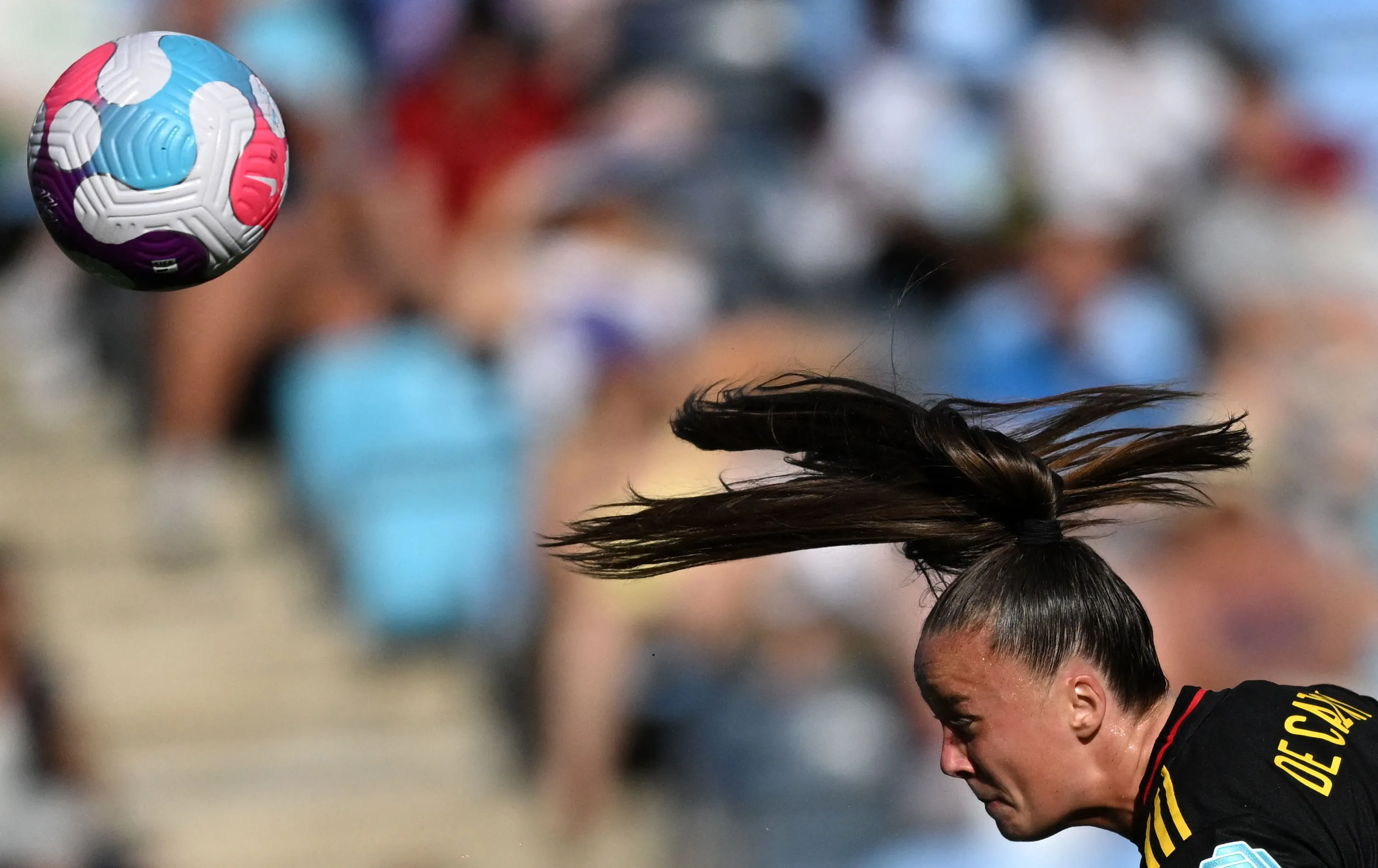 Belgium's striker Tine De Caigny headers the ball during the UEFA Women's Euro 2022 Group D football match between Belgium and Iceland at Manchester City Academy Stadium in Manchester, north-west England on July 10, 2022. (Photo by Daniel Mihailescu/AFP Photo)
