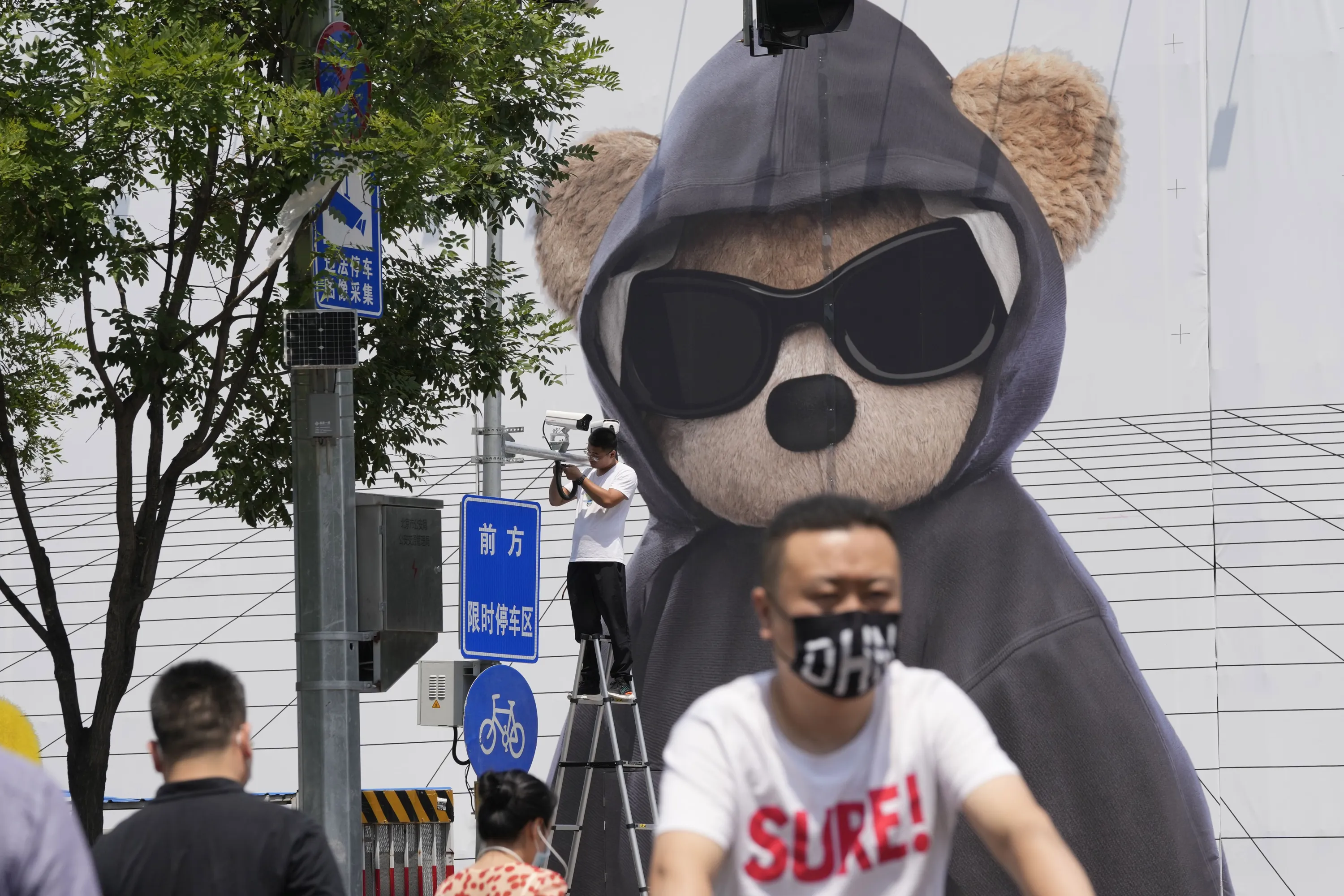 A worker installs a surveillance camera outside a mall, Friday, July 8, 2022, in Beijing. China's economic growth plunged to 0.4% over a year earlier in the latest quarter after Shanghai and other cities were shut down to fight coronavirus outbreaks, but the government said a “stable recovery” is underway. (Photo by Ng Han Guan/AP Photo)