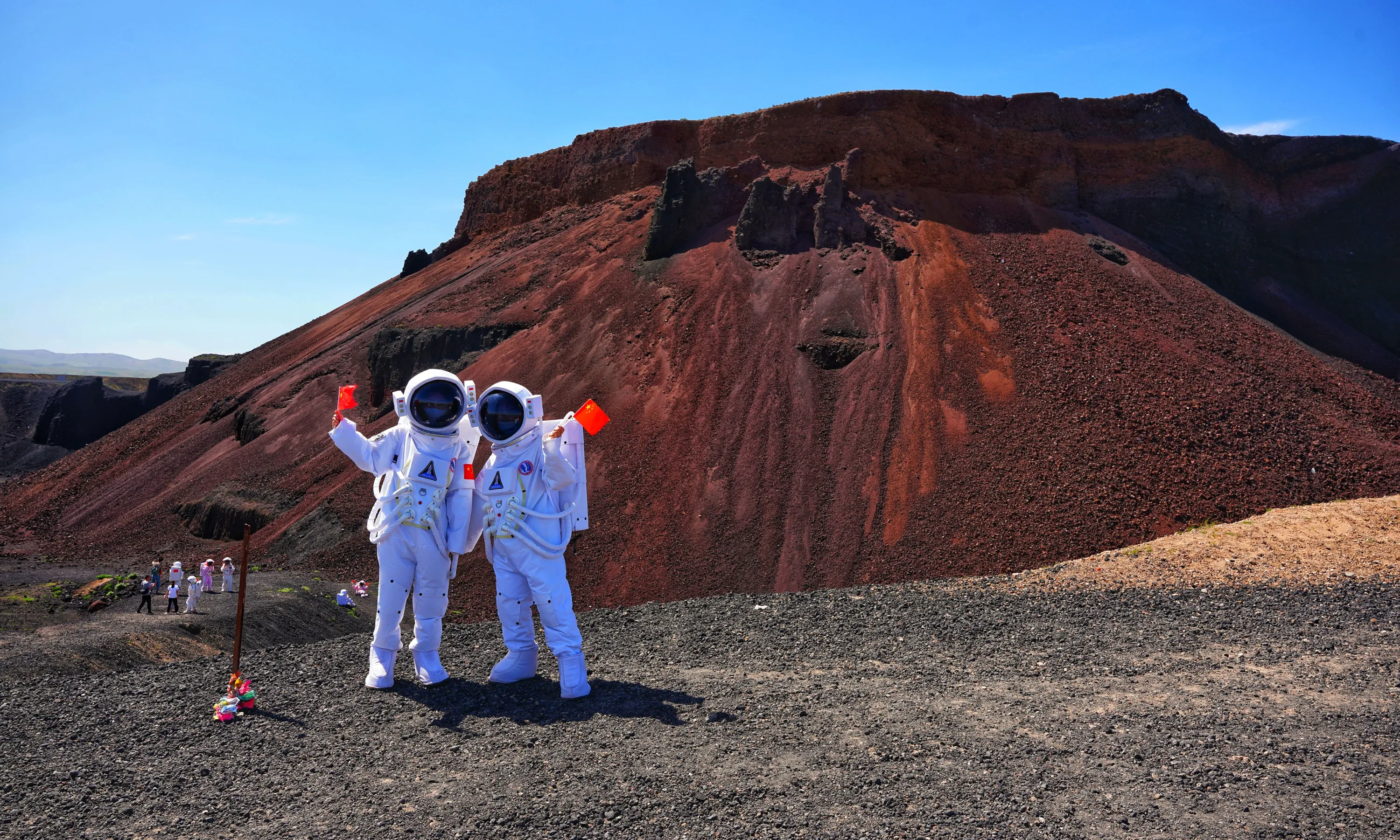 Tourists dressed like astronauts visit Ulan Hada Volcano Geopark on July 16, 2022 in Ulanqab, Inner Mongolia Autonomous Region of China. (Photo by VCG/VCG via Getty Images)