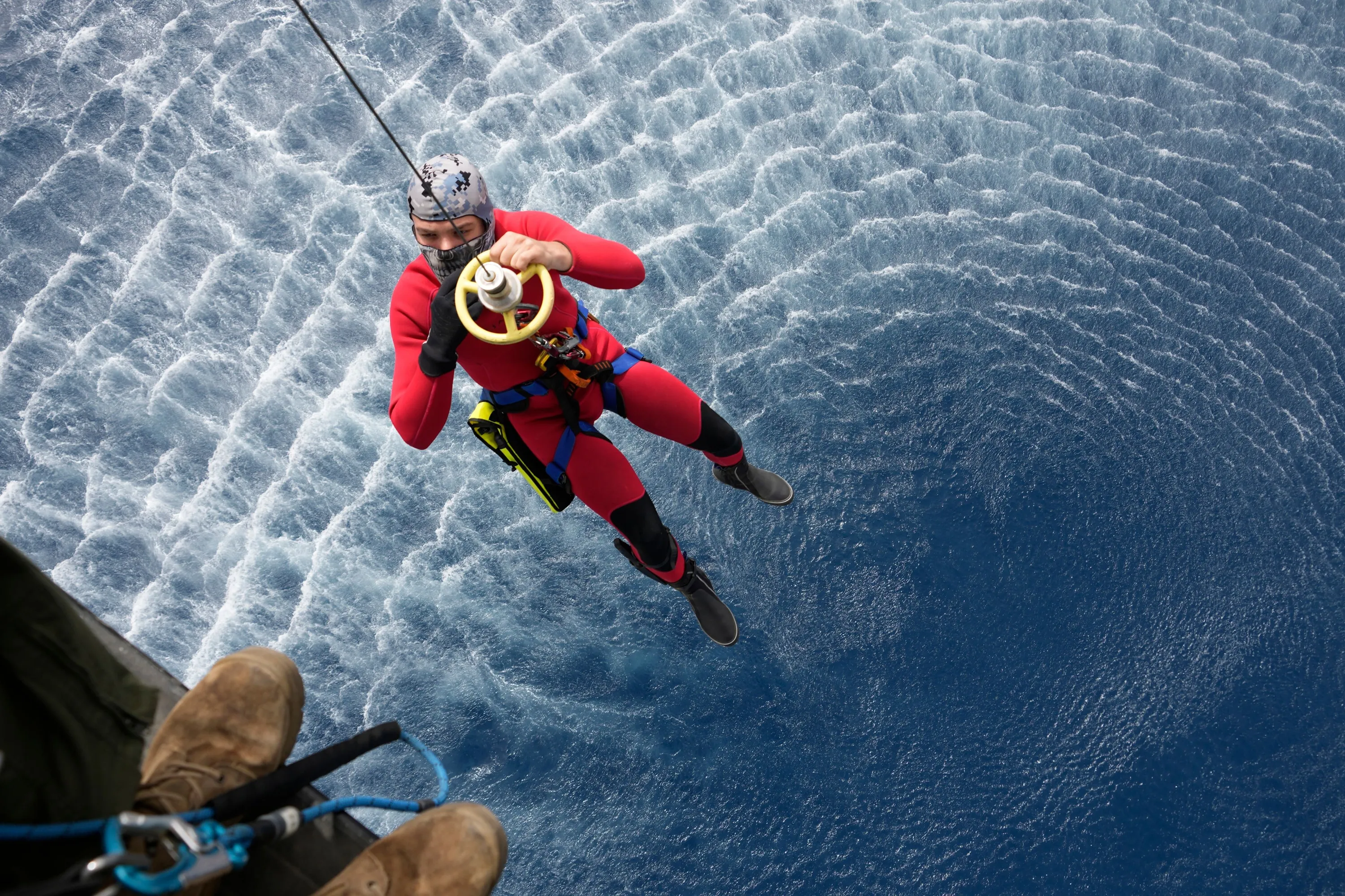 A Lebanese navy rescuer is lowered on rope from a helicopter as the search for bodies continues following the sinking over the weekend of a boat packed with migrants as the Lebanese navy tried to force it back to shore, in Tripoli, north Lebanon, Monday, April 25, 2022. The small vessel was carrying nearly 60 people, many times its capacity, when the disaster struck on Saturday night. The tragedy was the latest in a growing trend involving mostly Lebanese and Syrians trying to travel to Europe from Lebanon in search of better lives. (Photo by Hassan Ammar/AP Photo)