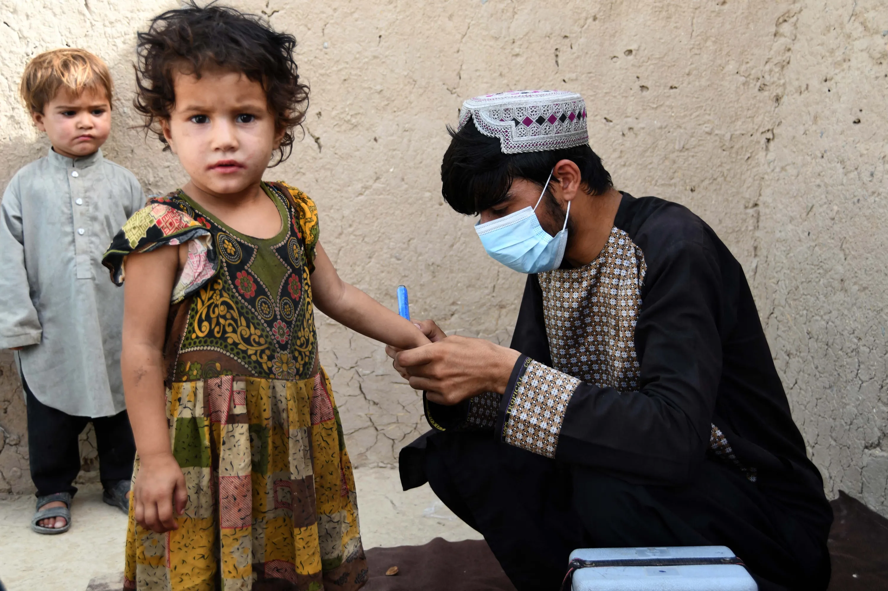 A health worker marks a child's finger with ink after giving polio vaccine at a campaign in Kandahar on June 28, 2022. (Photo by Javed Tanveer/AFP Photo)