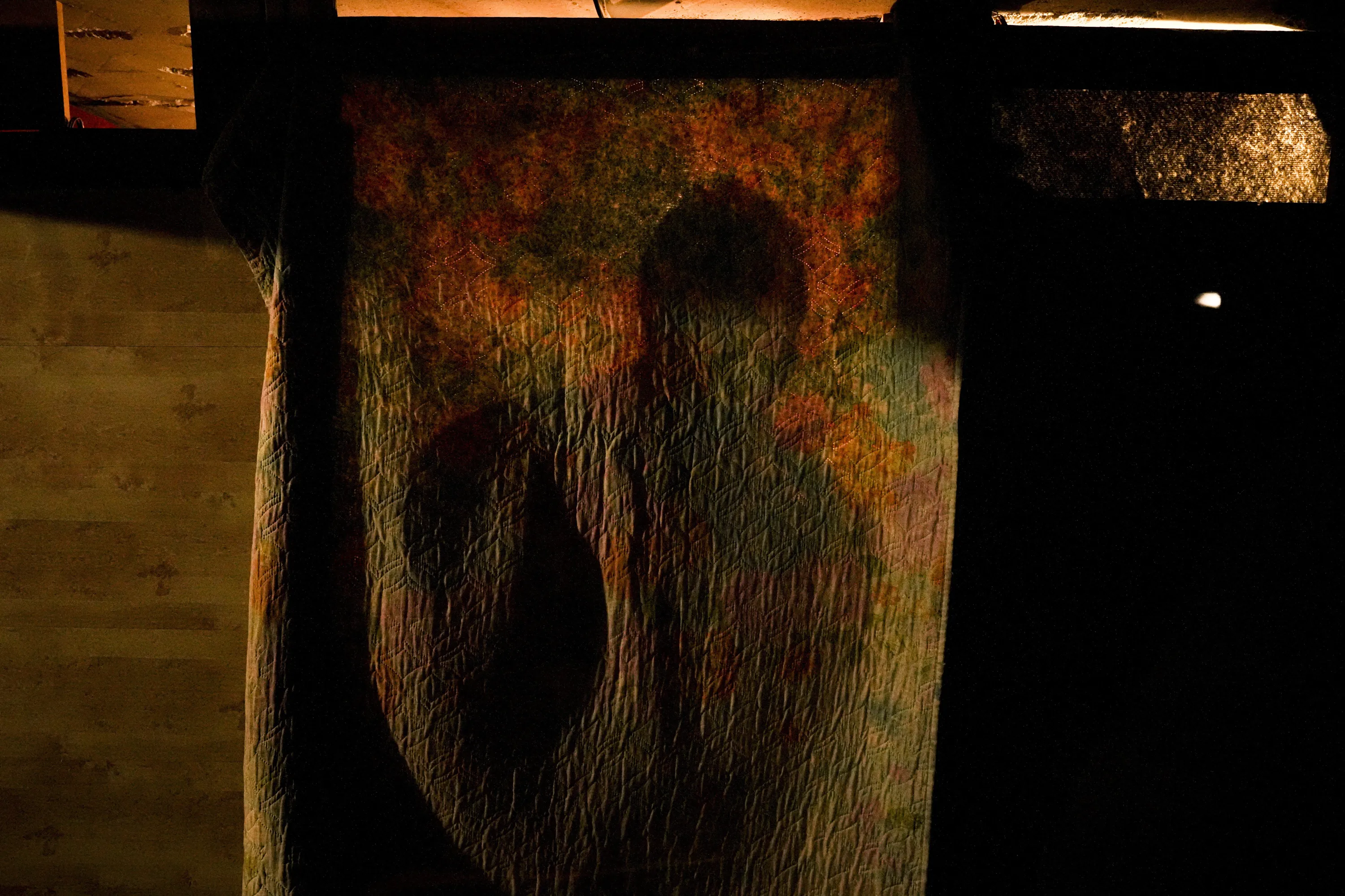 Ukrainian serviceman Ivan Skuratovskyi casts a shadow on the curtain that serves as a door for his sleeping space after patrolling a frontline position outside Avdiivka, Donetsk region, eastern Ukraine, Friday, February 4, 2022. (Photo by Vadim Ghirda/AP Photo)