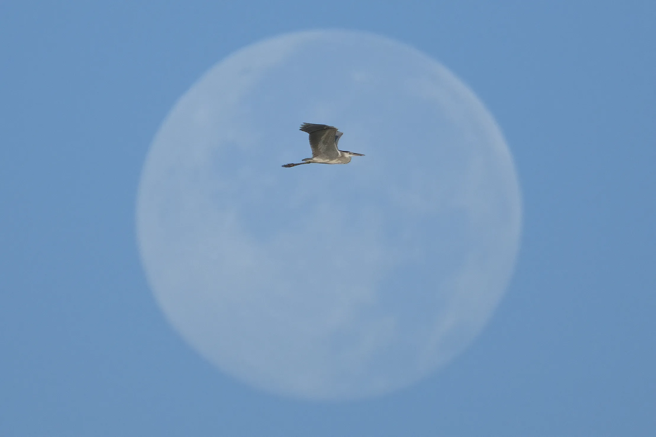 A Gray heron flying in front of the moon in the early morning in Kapar on the outskirt of Selangor state, Malaysia, Saturday, March 19, 2022. (Photo by Vincent Thian/AP Photo)