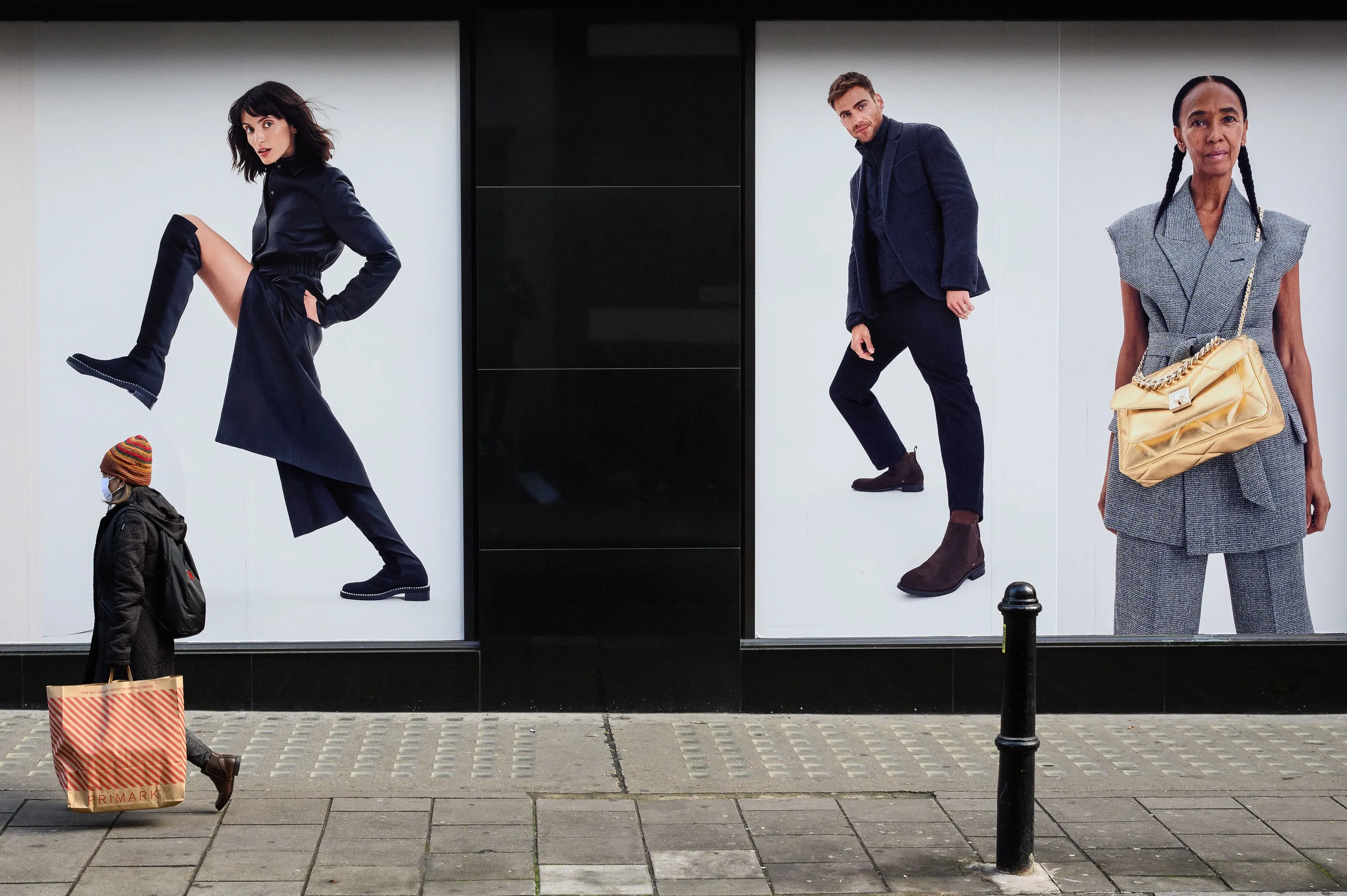 A model in an advertisement appears to step on shoppers in the retail district near Oxford Circus as the annual Black Friday sale event arrives, on November 26, 2021 in London, England. In-store Black Friday spending is expected to grow by 7.3 per cent in the UK this year. (Photo by Leon Neal/Getty Images)