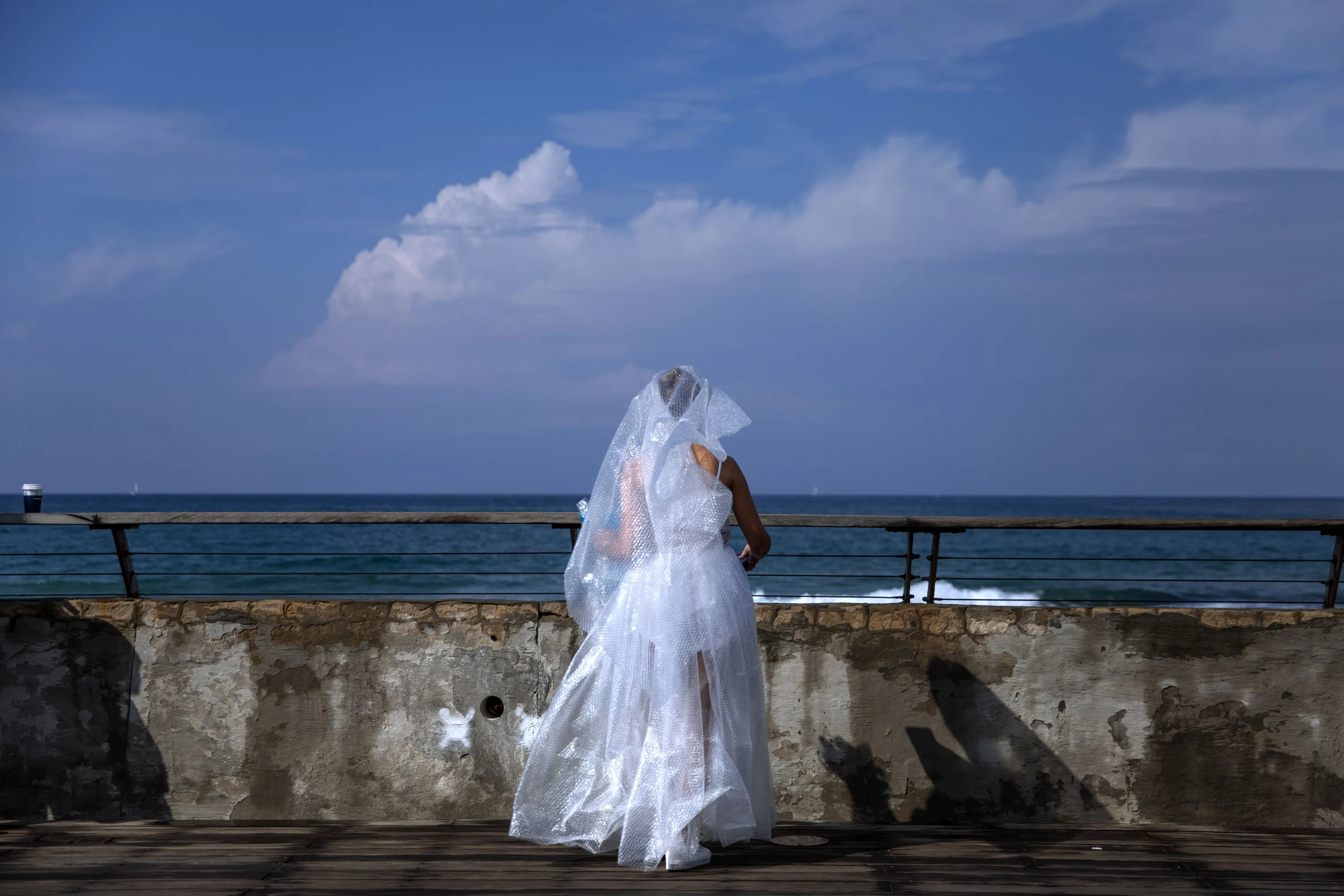 An environmental activist dressed in waste mostly from plastic in a rally called Fashion Revolution, to raise climate awareness, in Tel Aviv, Friday, November 19, 2021. (Photo by Oded Balilty/AP Photo)