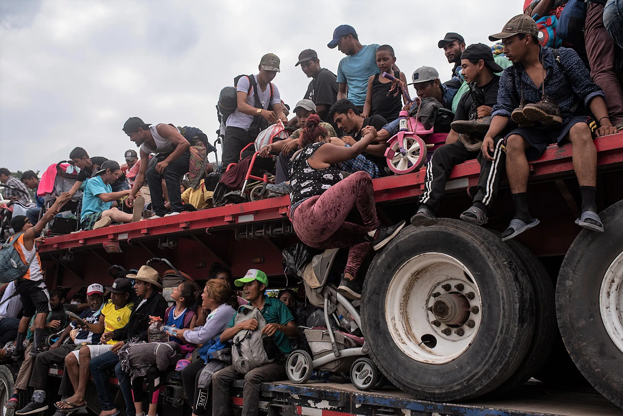Central American migrants travel in trucks during their caravan to the north, in the municipality of Jesus Carranza, Veracruz state, Mexico, 17 November 2021. The caravan of Central American migrants heading to the United States rested on Wednesday after crossing the border of the western Mexican state of Veracruz at a slower pace, where they are guarded by a strong security device. (Photo by Angel Hernandez/EPA/EFE)