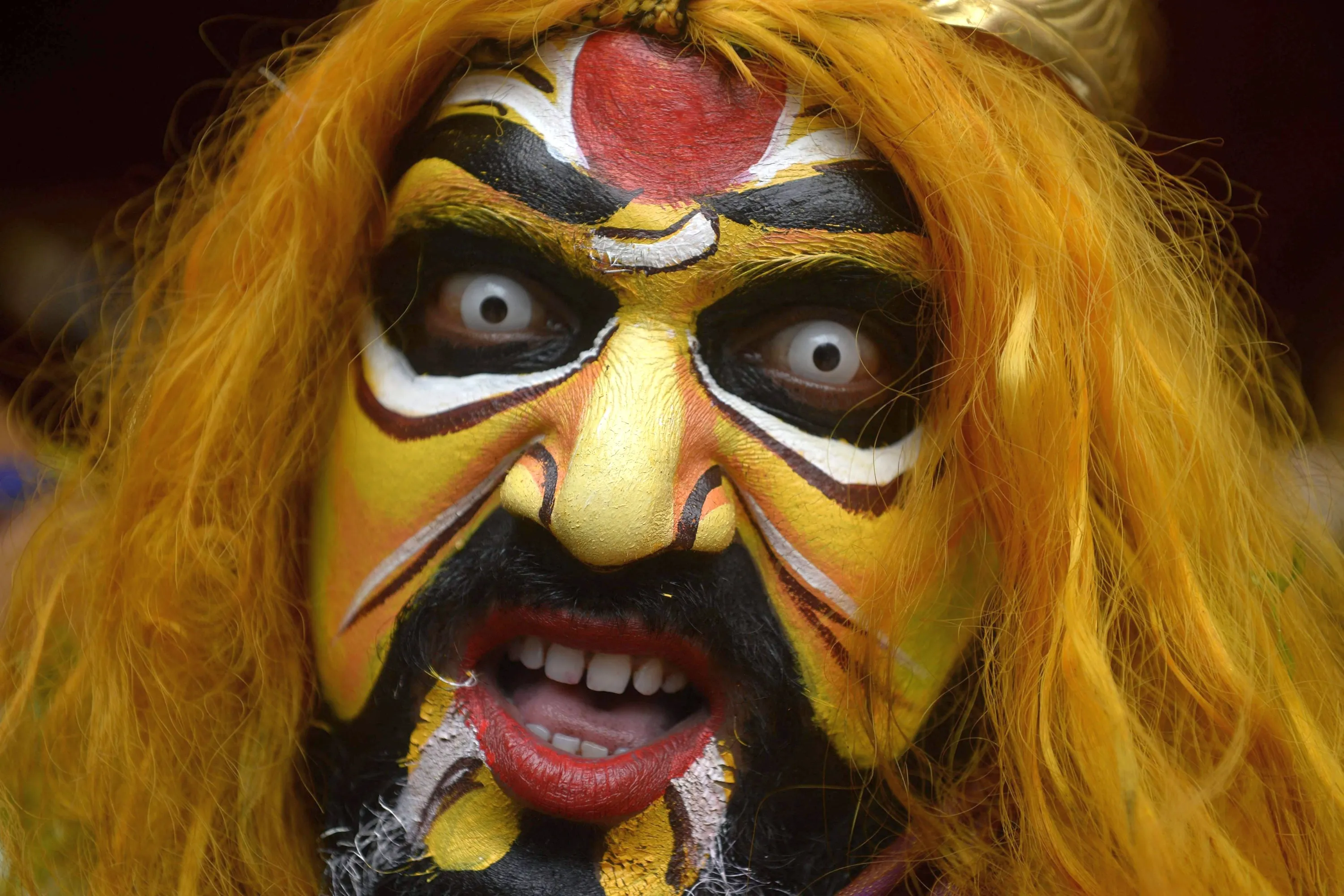A Hindu devotee dressed as Potharaju, the brother of the Hindu goddess Mahakali, performs during the Bonalu festival procession at the Sri Ujjaini Mahakali Temple in Secunderabad, the twin city of Hyderabad on July 18, 2022. (Photo by Noah Seelam/AFP Photo)