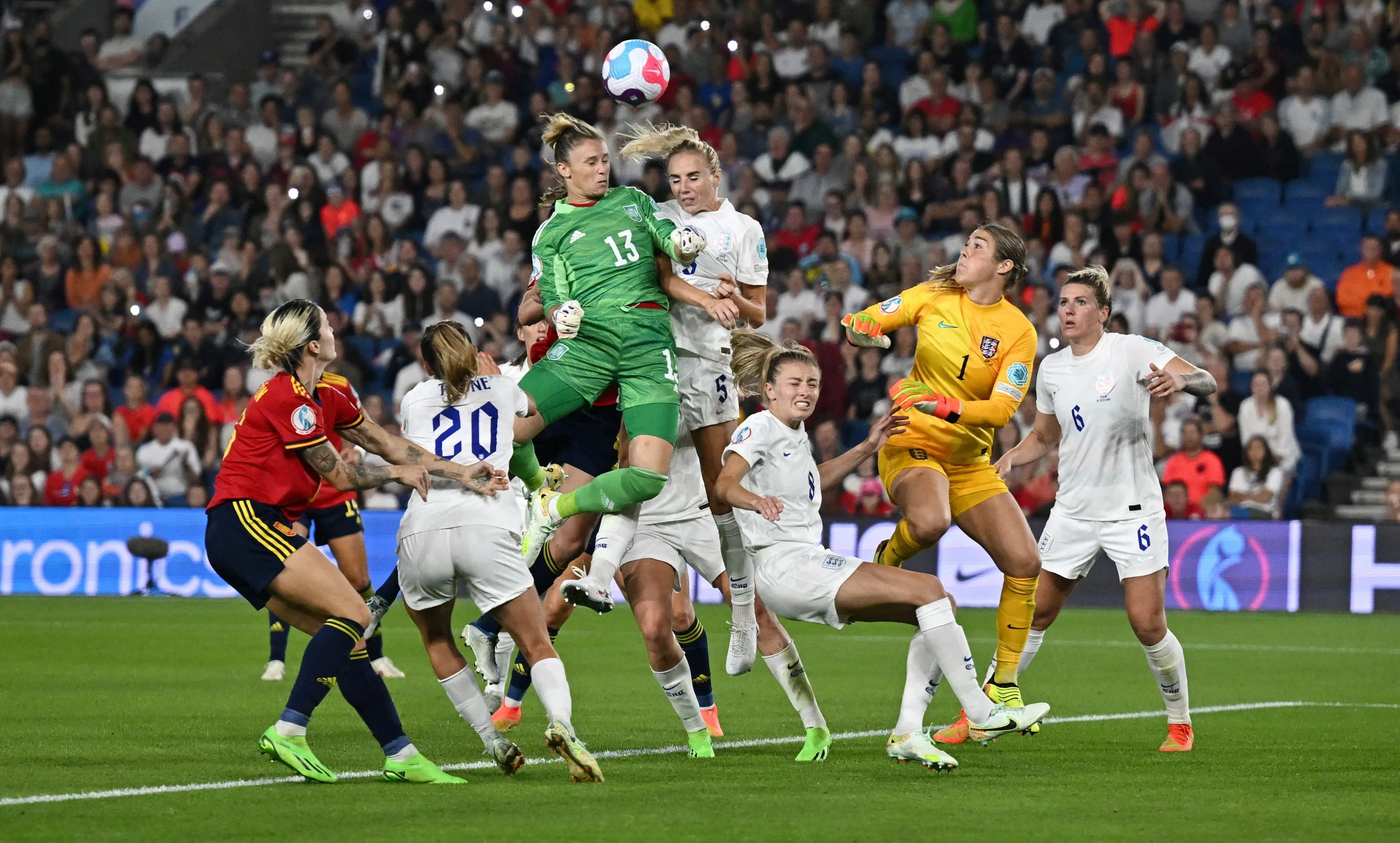 Spain's goalkeeper Sandra Panos in action against England's Alex Greenwood and Mary Earps, in their Euro 2022 quarter final match at the Amex Stadium, Brighton, on England's south coast on July 20, 2022. England beat Spain 2-1, after extra time. (Photo by Dylan Martinez/Reuters)