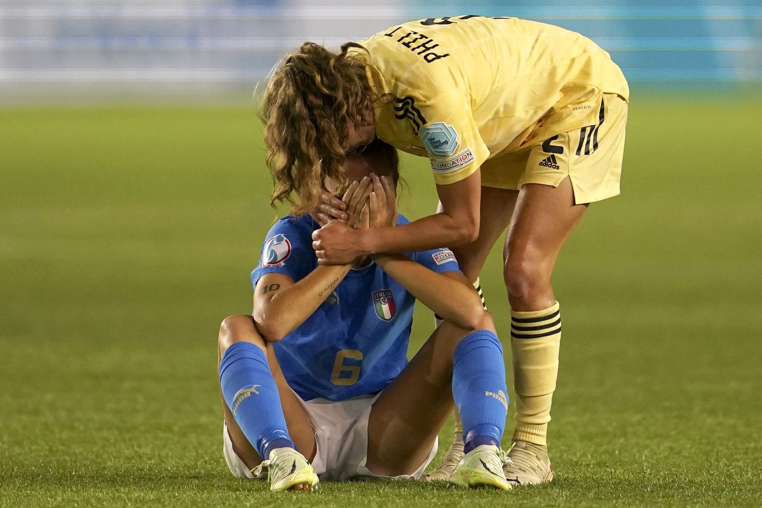 Belgium's Davina Philtjens comforts Italy's Manuela Giugliano sitting on the ground at the end of the Women Euro 2022 group D soccer match between Italy and Belgium at the Manchester City Academy Stadium, in Manchester, England, Monday, July 18, 2022. Belgium won 1-0 to advance to the quarterfinals. (Photo by Jon Super/AP Photo)