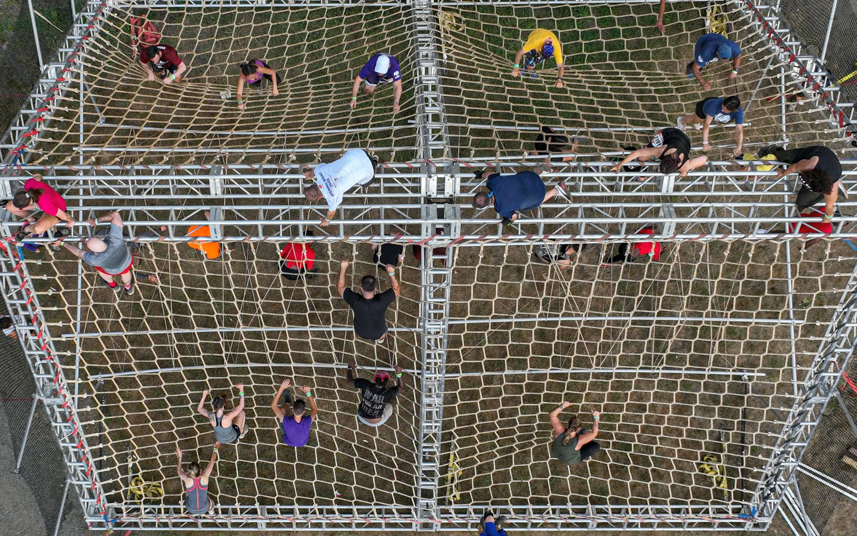 Runners participate in the Rugged Maniac 5K Mud Run at Raceway Park in Manalapan, New Jersey on July 16, 2022. Rugged Maniac is an endurance event series in which participants attempt 3 mile-long obstacle courses featuring steep inclines, water hazards and military-style obstacles testing one's toughness, fitness, strength, stamina and mental grit. (Photo by Lokman Vural Elibol/Anadolu Agency via Getty Images)