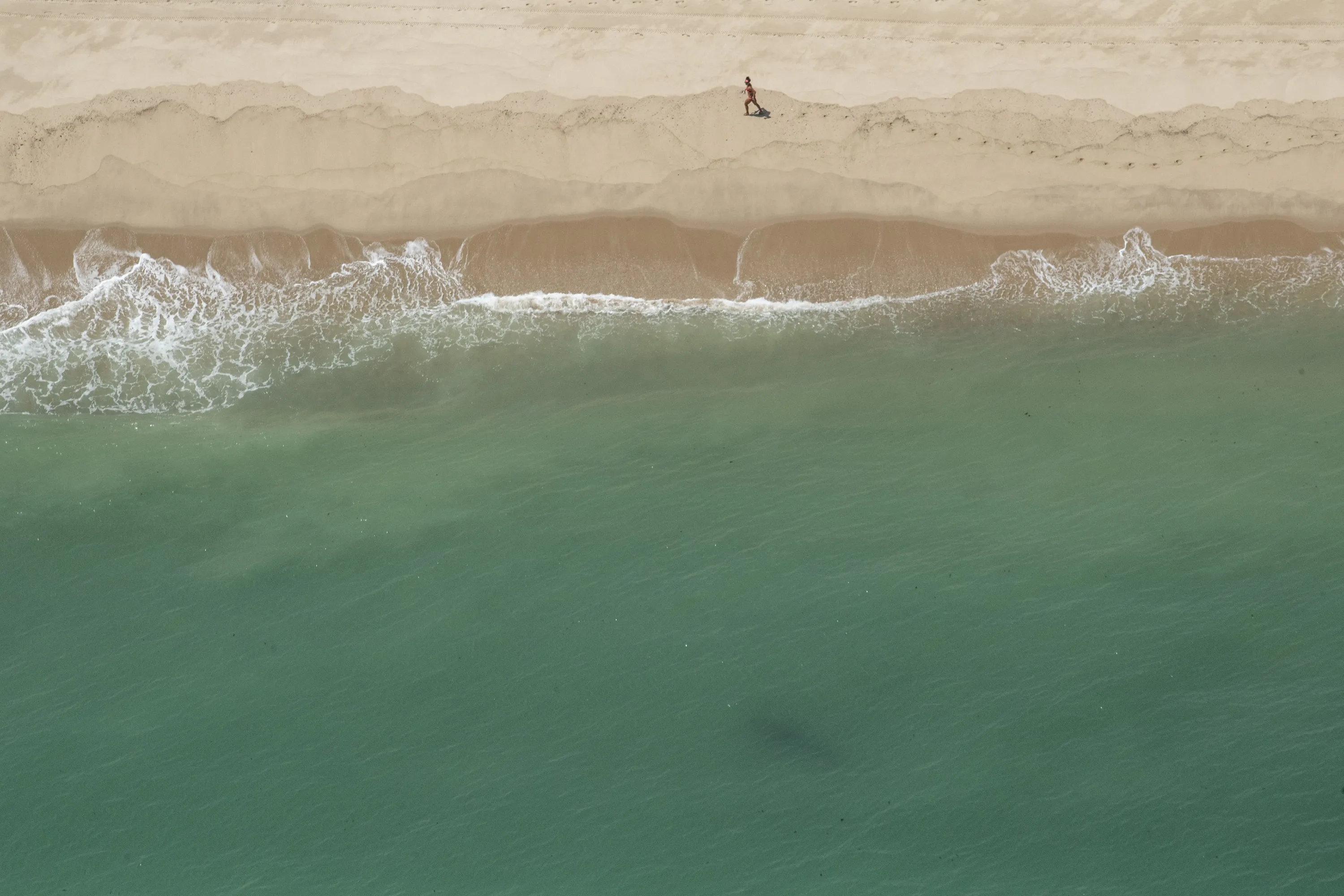 A person runs parallel to a Great White Shark just offshore from the Cape Cod National Sea Shore in Cape Cod, Massachusetts on July 15, 2022. The coast of Massachusetts is home to many White Sharks during the summer months. With interest in sharks growing, a shark related tourism industry has sprung up in places like Chatham, including sightseeing tours. (Photo by Joseph Prezioso/AFP Photo)