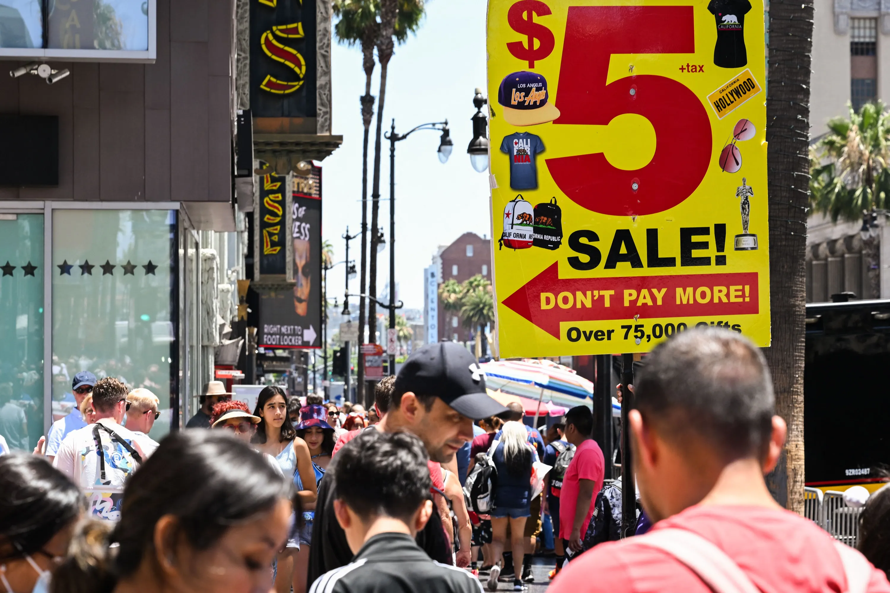 A sign outside a souvenir shop advertises items on sale for five dollars as tourists walk along Hollywood Blvd on July 13, 2022 in Los Angeles, California. US consumer price inflation surged 9.1 percent over the past 12 months to June, the fastest increase since November 1981, according to government data released on July 13. Driven by record-high gasoline prices, the consumer price index jumped 1.3 percent in June, the Labor Department reported. (Photo by Patrick T. Fallon/AFP Photo)