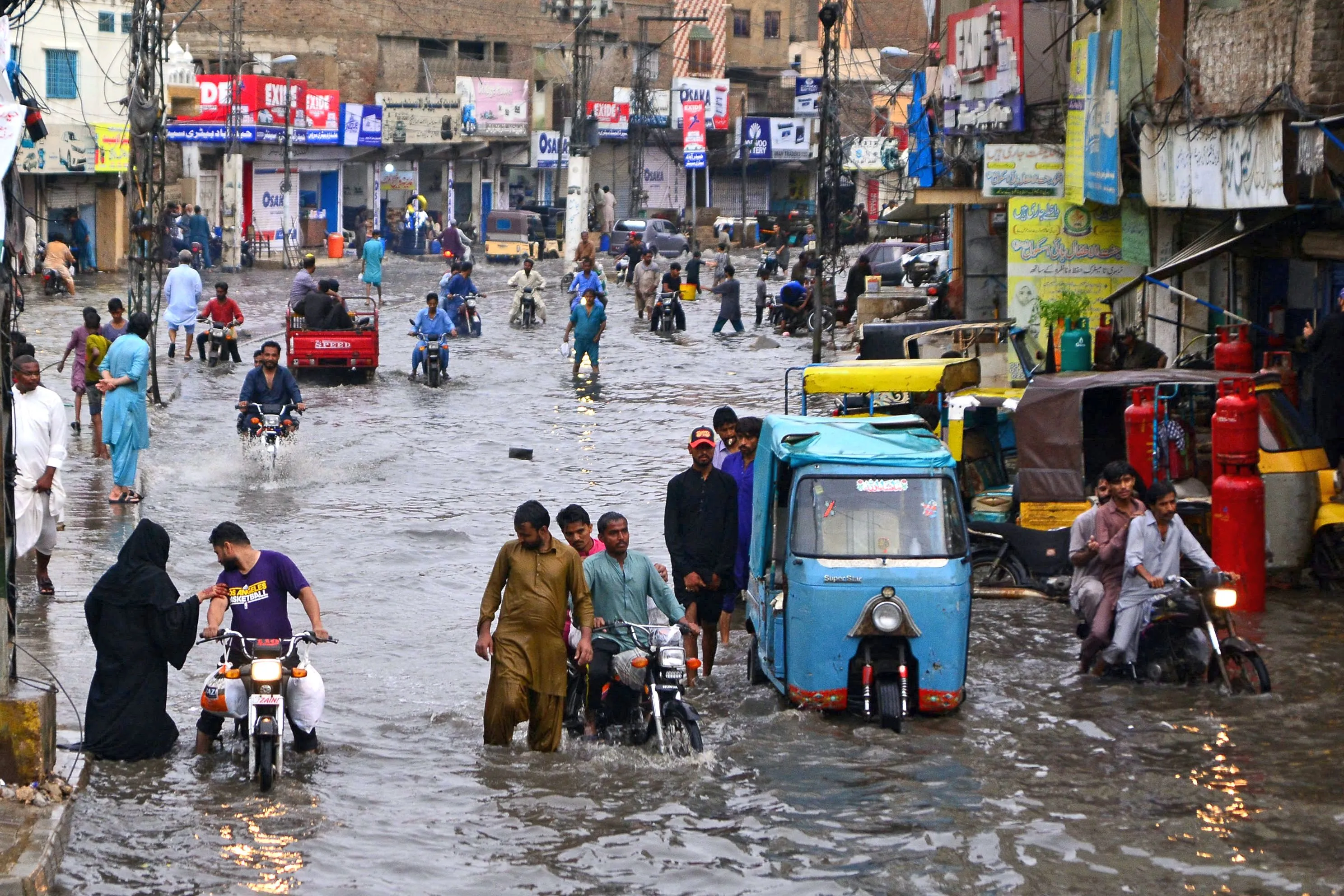 Commuters make their way through a flooded street during monsoon rainfall in Hyderabad, Pakistan on July 24, 2022. (Photo by Akram Shahid/AFP Photo)