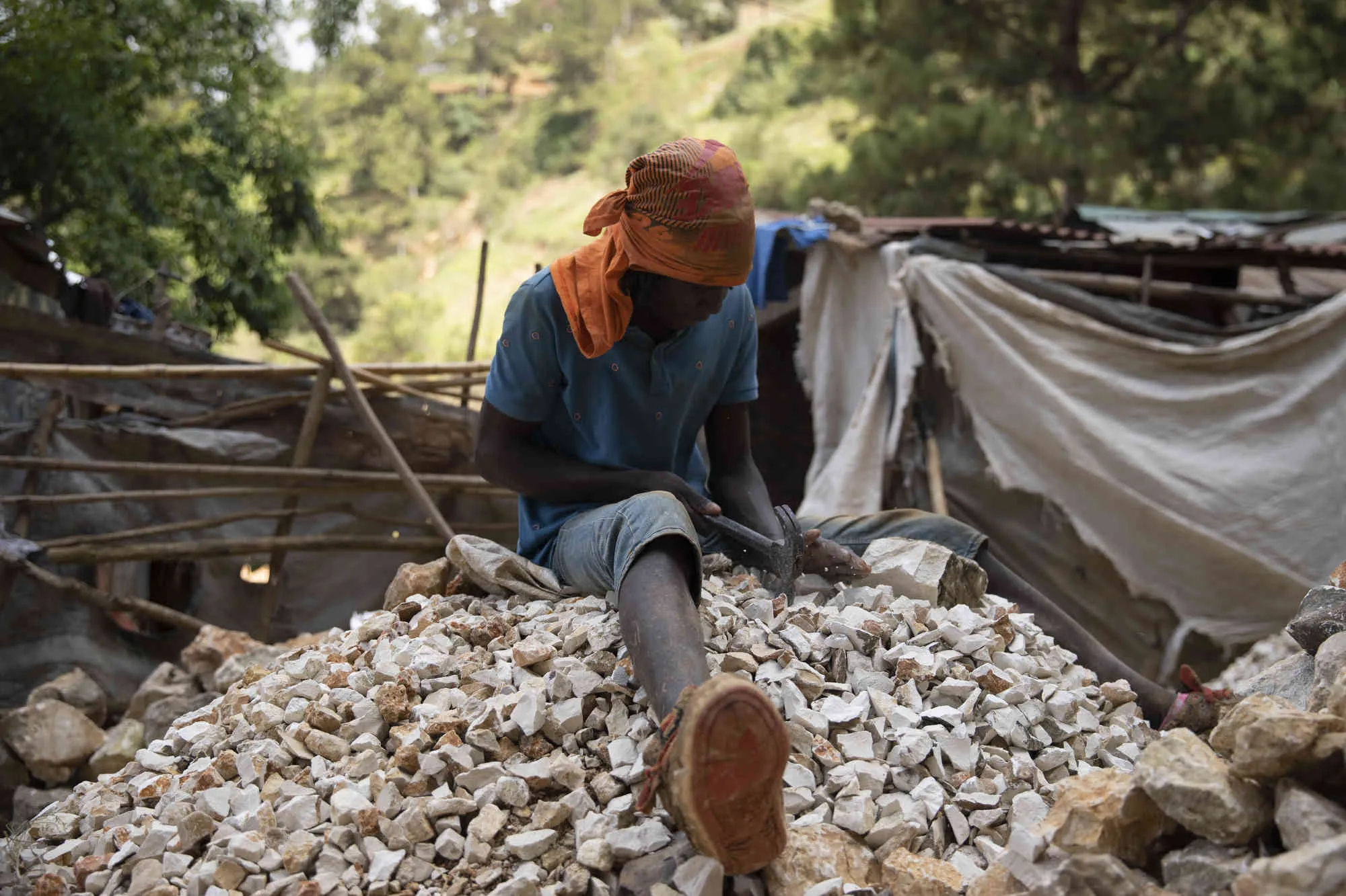 A man breaks rocks into gravel for construction sites in the Kenscoff neighborhood of Port-au-Prince, Haiti, Friday, June 24, 2022. (Photo by Odelyn Joshep/AP Photo)