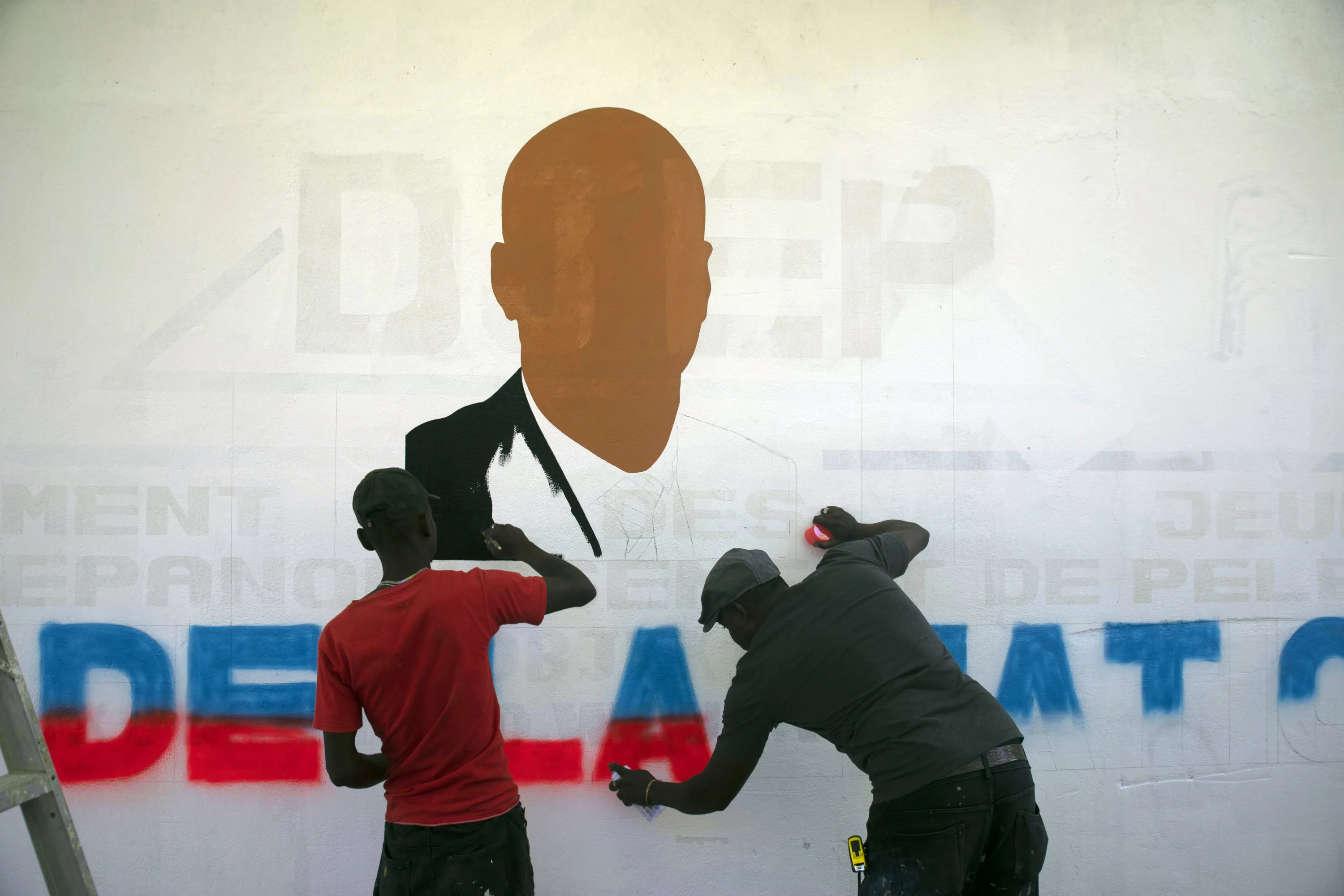 Artists paint a portrait of slain Haitian President Jovenel Moise near the presidencial residence where he was assassinated in the Petion-ville area of Port-au-Prince, Haiti, Thursday, July 7, 2022. A year has passed since Moise was assassinated at his private home. (Photo by Odelyn Joseph/AP Photo)